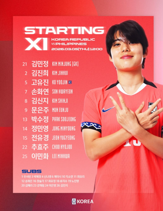 신상우 감독은 필리핀을 무너뜨리기 위해 4-4-2 포메이션을 선택했다. 최전방에는 손화연(강진SWAN)과 전유경(수원FC위민)이 투톱으로 나서 골문을 노린다. 중원에는 '유럽파' 김신지(레인저스)와 박수정(AC밀란)을 필두로 정민영(오타와래피드), 문은주(화천KSPO)가 배치되어 날카로운 패스 공급을 책임진다.