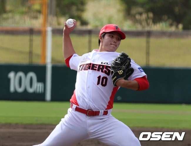 KIA 타이거즈 2년차 김태형(20)이 무사 만루 위기 포함해 두 번의 실점위기는 넘기는 투구를 펼쳤다. 5일 오키나와현 긴타운베이스볼스타디움에서 열린 2026 스프링캠프 KT 위즈와의 연습경기에 등판해 2이닝을 던졌다. 2안타와 2볼넷을 내주었지만 2개의 탈삼진을 곁들여 실점없이 등판을 마쳤다.