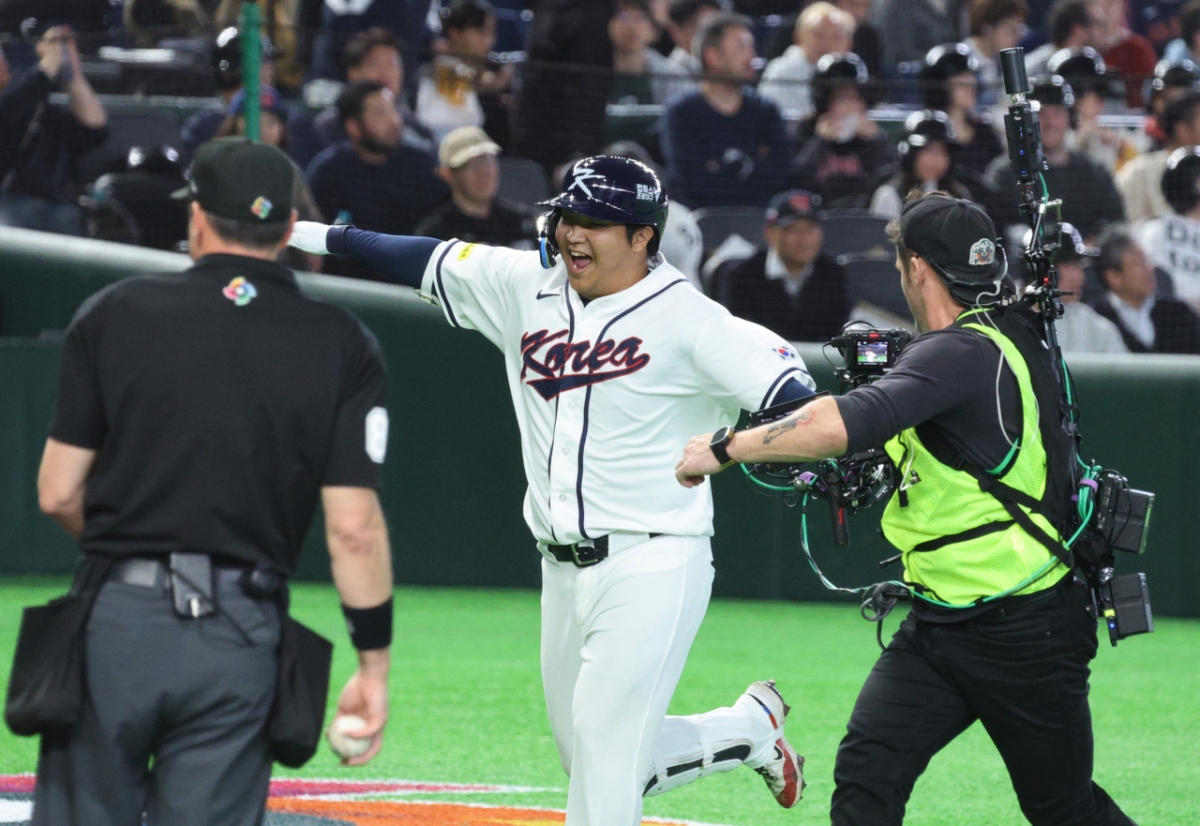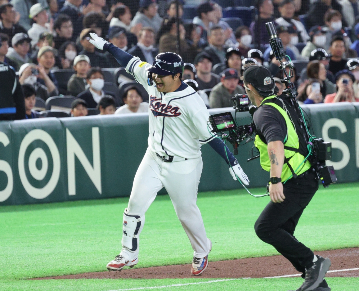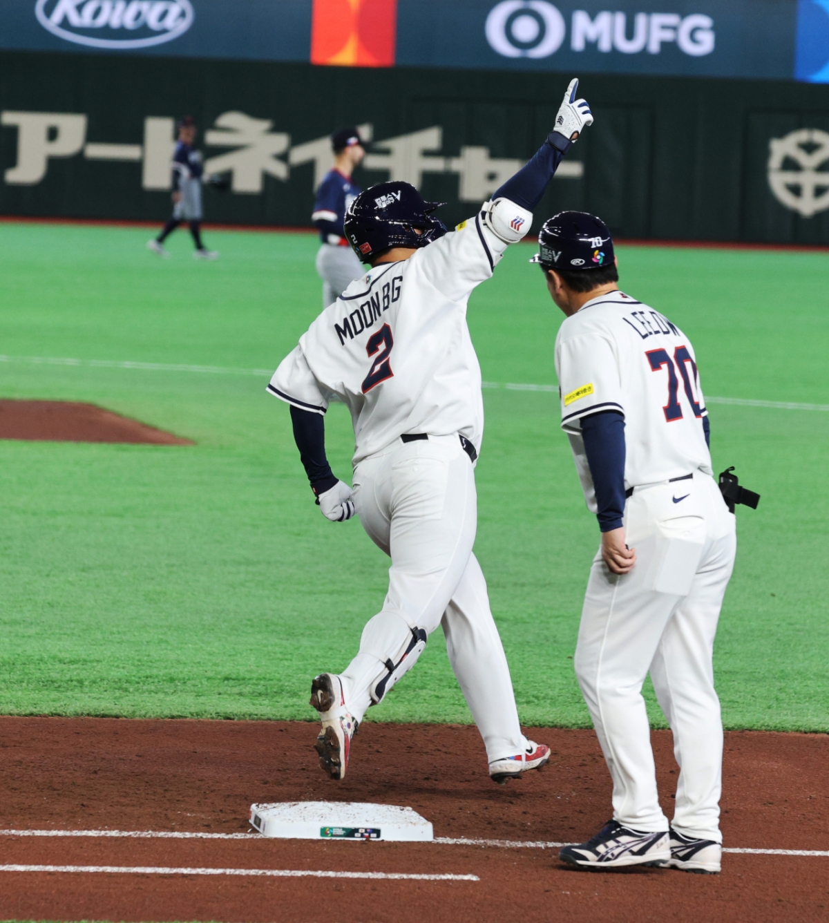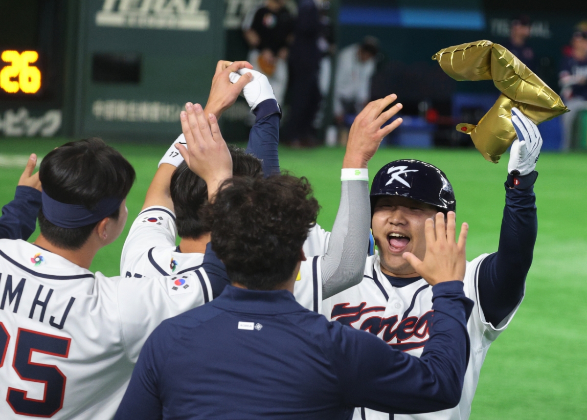 야구대표팀 5번타자 문보경이 5일 도쿄돔에서 열린 2026WBC 도쿄POOL 개막 두번째경기 한국과 체코경기 1회말 1사 만루에서 만루홈런을 터트렸다. 그는 홈인 후 비행기 세리머니를 펼쳤고 동료들의 격한 축하를 받았다. 안현민, 김도영, 이정후, 박해민 등 동료들이 문보경을 축하했다.