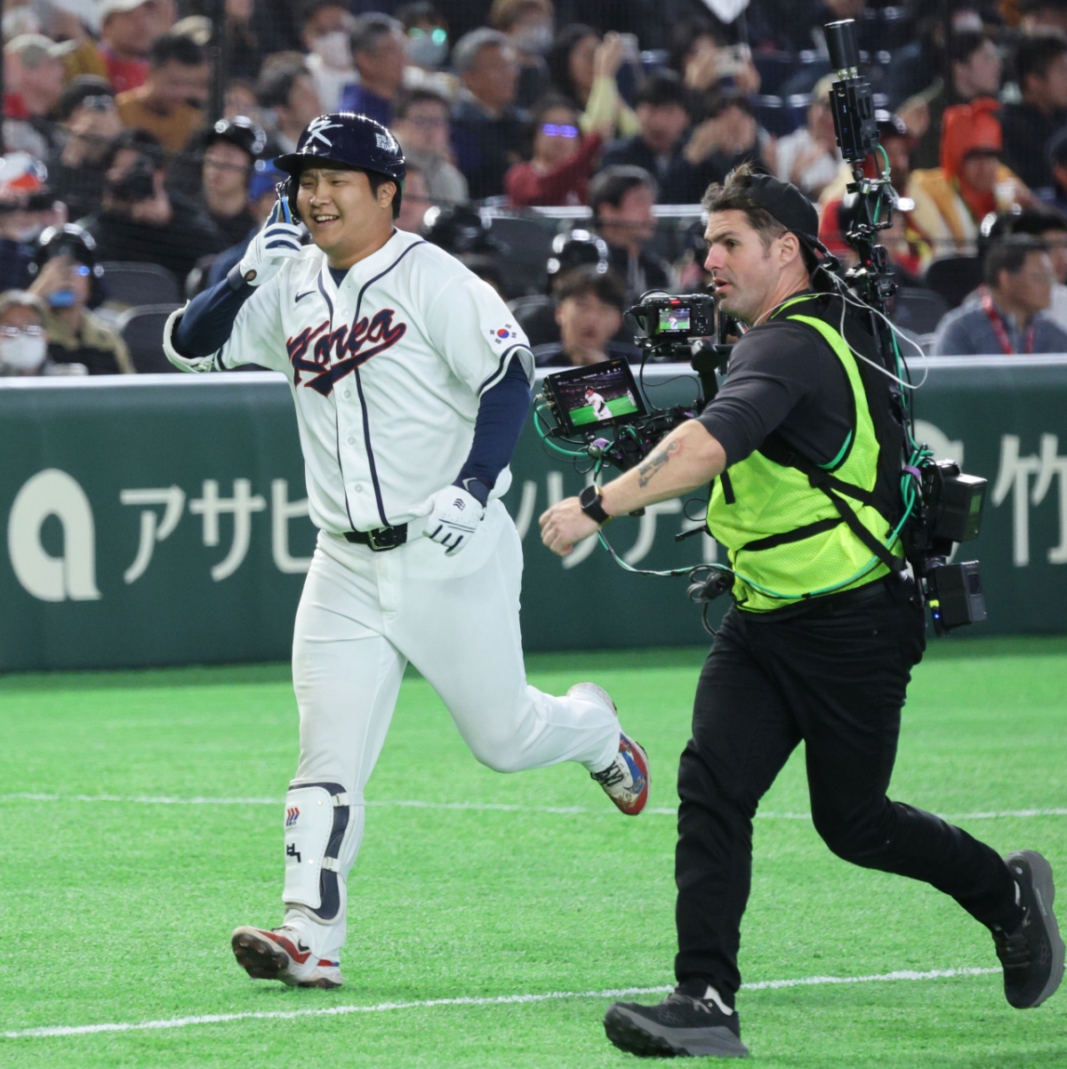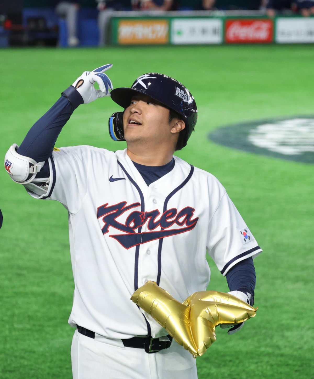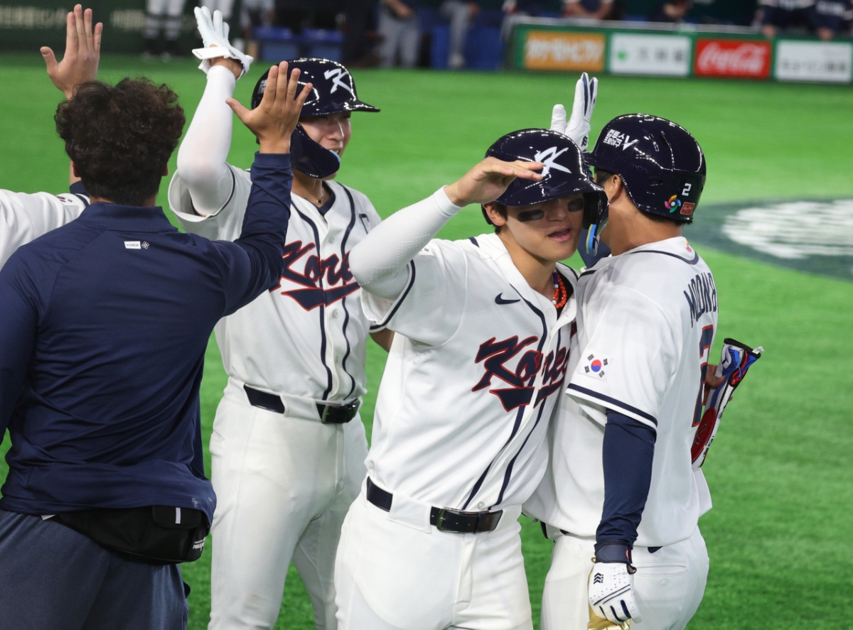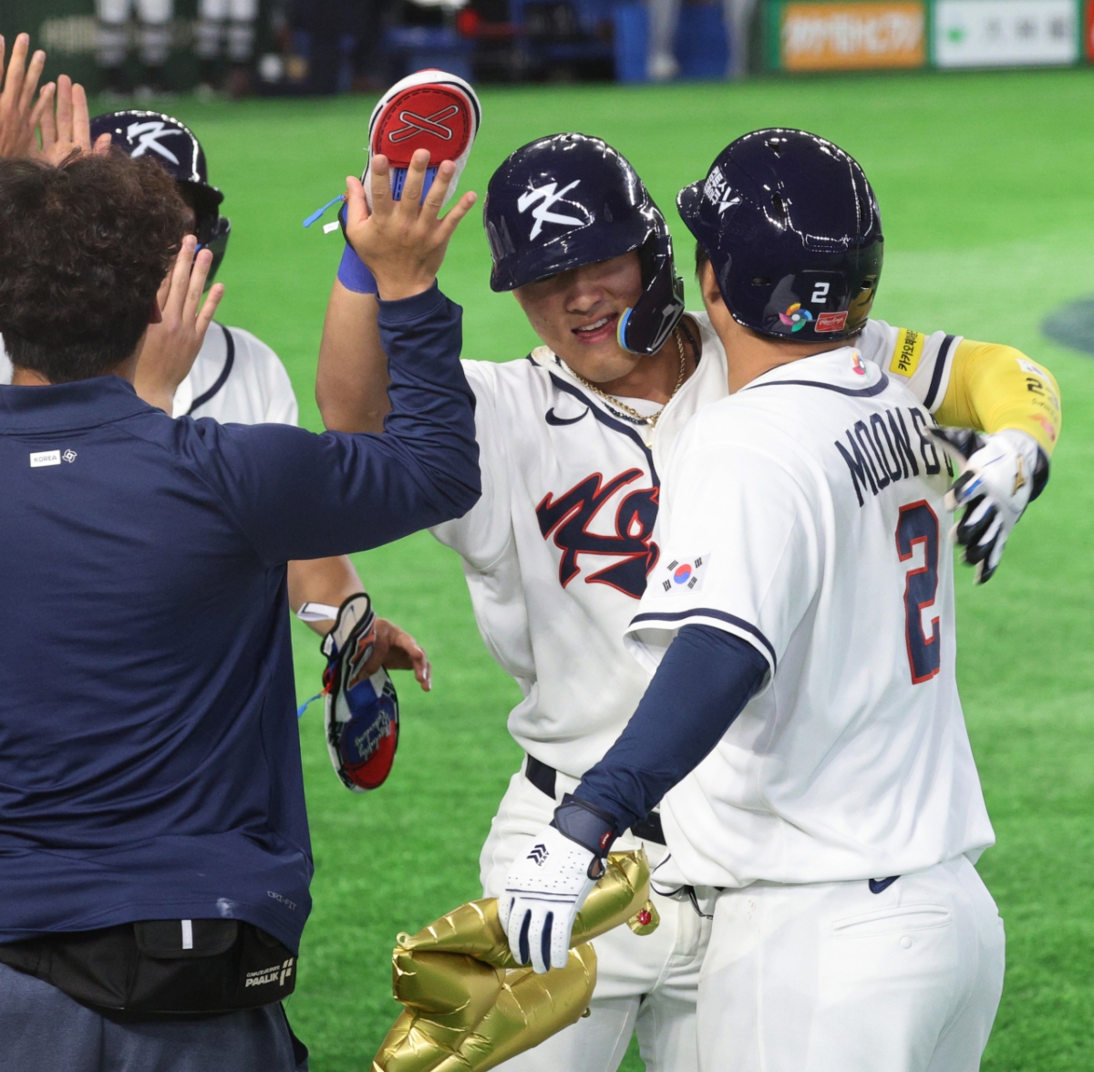 야구대표팀 5번타자 문보경이 5일 도쿄돔에서 열린 2026WBC 도쿄POOL 개막 두번째경기 한국과 체코경기 1회말 1사 만루에서 만루홈런을 터트렸다. 그는 홈인 후 비행기 세리머니를 펼쳤고 동료들의 격한 축하를 받았다. 안현민, 김도영, 이정후, 박해민 등 동료들이 문보경을 축하했다.