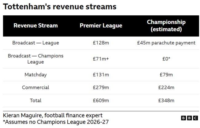 축구 재정 전문가 키어런 매과이어는 "토트넘 같은 규모와 야망을 가진 구단에게 강등은 단순한 스포츠적 실패로 끝나지 않는다. 잉글랜드 축구의 경제 구조를 고려하면 회복에는 여러 해가 걸릴 수 있다"라고 설명했다.