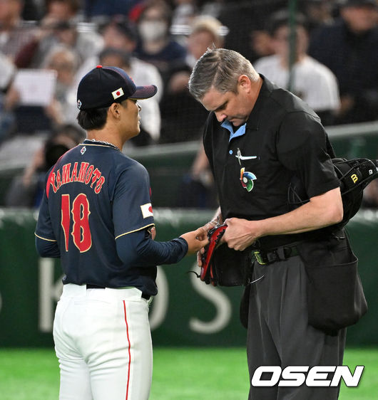 6일 일본 도쿄돔에서 월드베이스볼클래식(WBC) 조별리그 C조 일본과 대만의 경기가 열렸다. 일본은 야마모토 요시노부, 대만은 쩡하오쥔을 선발로 내세웠다. 1회말 피칭을 마친 일본 야마모토 요시노부가 글러브 검사를 했다.