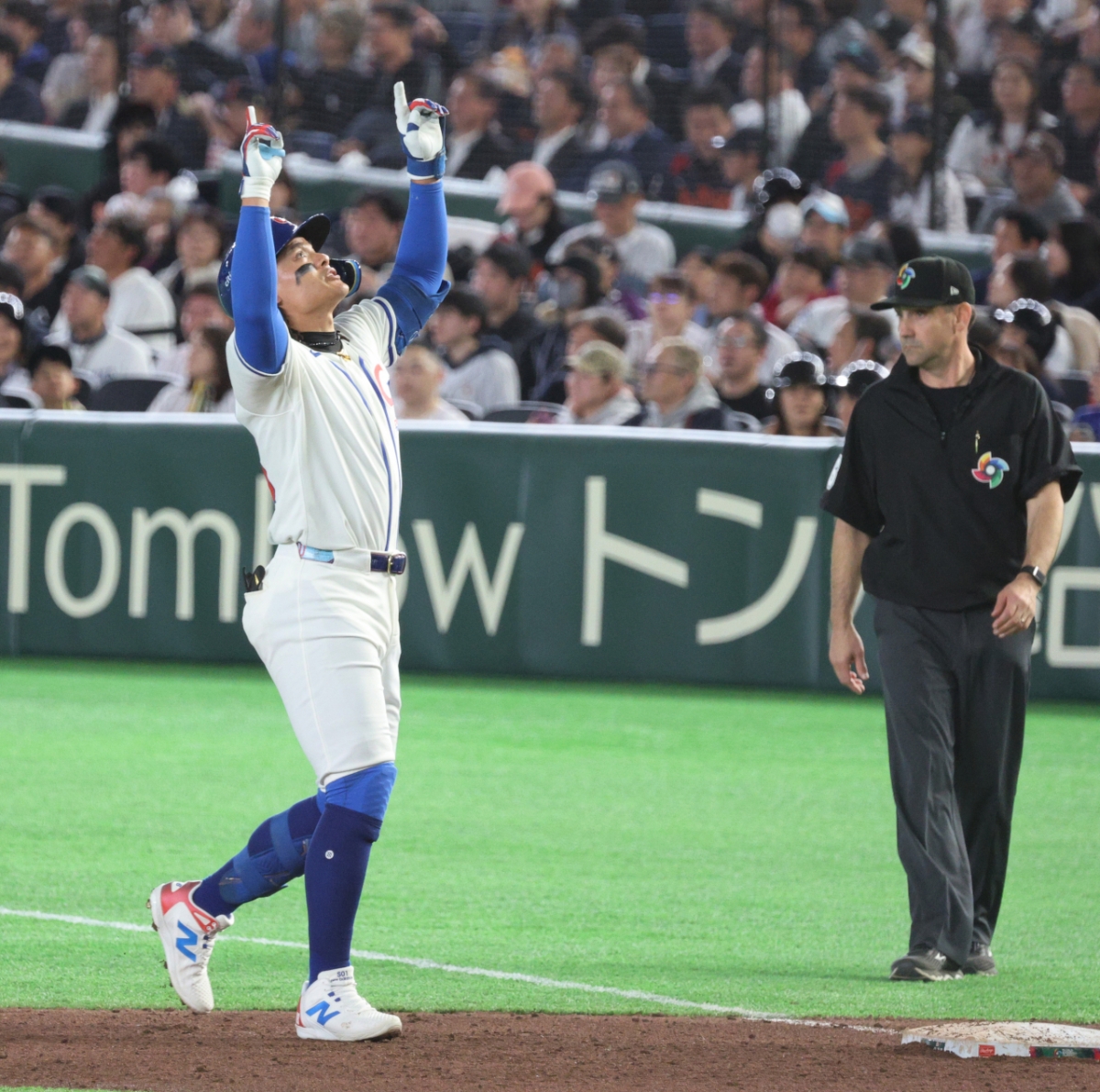 대만 장위청이 6일 도쿄돔에서 열린 2026WBC 도쿄POOL 대만과 일본경기 6회말 안타로 출루하고 있다. 2026.03.06.