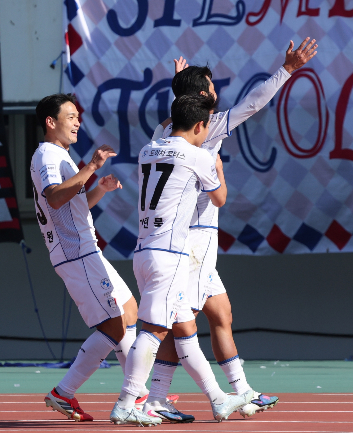 7일 경기도 파주 스타디움에서 하나은행 K리그2 2026 파주 프런티어FC 대 수원 삼성 경기가 열렸다. 수원 삼성 김지현이 헤더슛으로 첫 골을 터트렸다. 김지현은 골을 넣은 후 서포터스에게 달려가 기쁨을 나눴다.