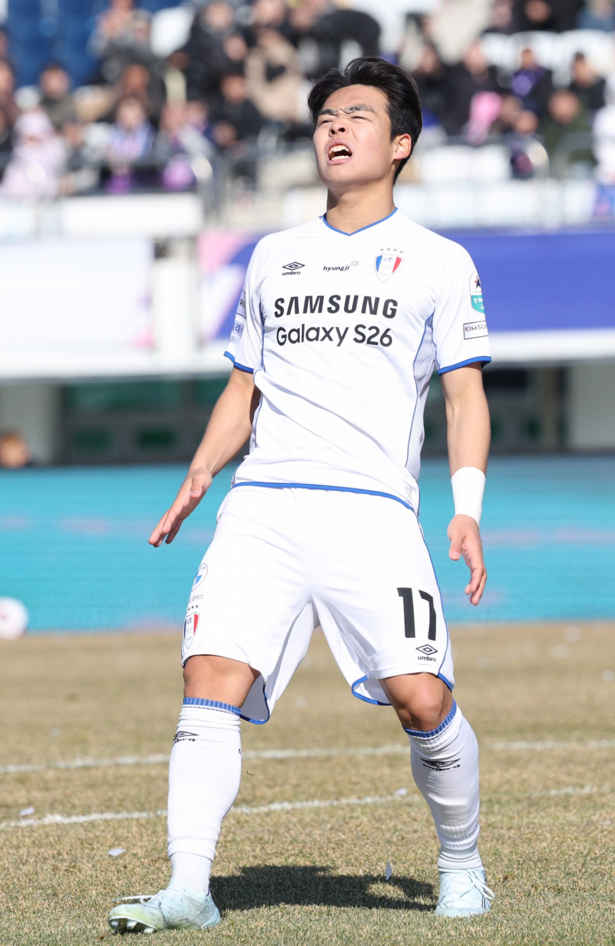 7일 경기도 파주 스타디움에서 하나은행 K리그2 2026 파주 프런티어FC 대 수원 삼성 경기가 열렸다. 수원 삼성 김지현은 페널티킥을 실축했다. 김지현은 페널티킥 실패 후 아쉬워했다.