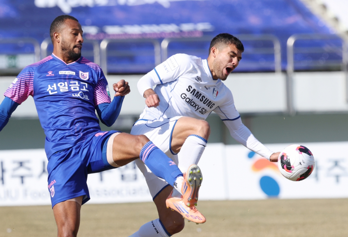 7일 경기도 파주 스타디움에서 하나은행 K리그2 2026 파주 프런티어FC 대 수원 삼성 경기가 열렸다. 이 경기에서 파주 FC 보닐라가 수원 삼성 실바와 공을 다투는 모습이 포착됐다. 사진은 브루노 실바가 공을 다투는 장면을 담고 있다.