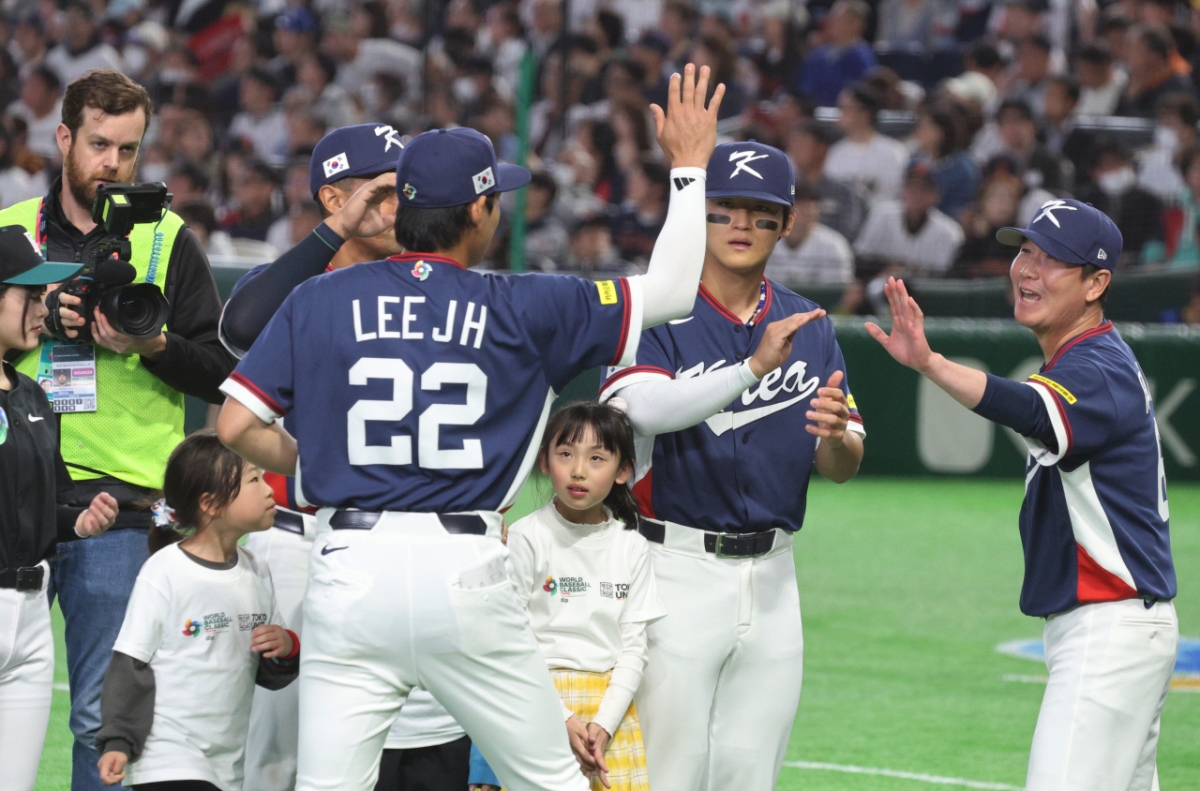 류지현 김독이 7일 도쿄돔에서 열린 2026WBC 도쿄POOL 대한민국과 일본의 경기 오프닝 세리머니에서 이정후와 하이파이브를 나누고 있다. 2026.03.05.