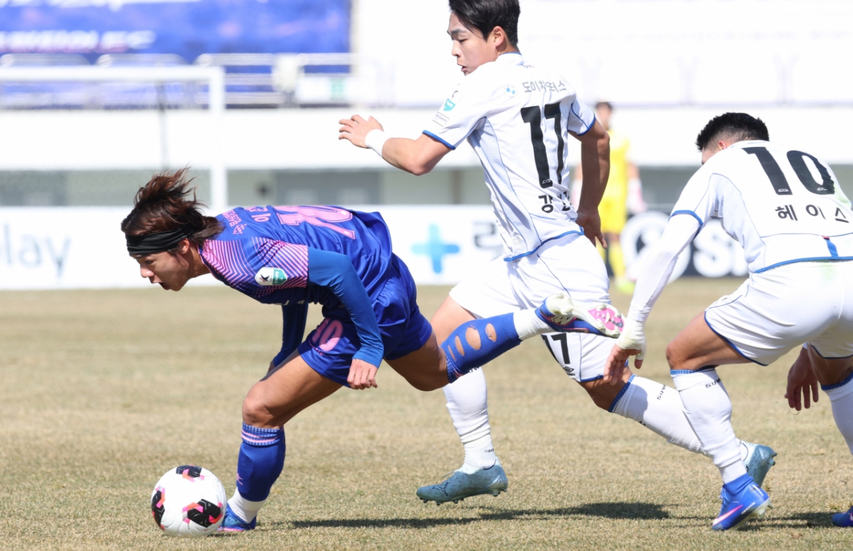 7일 경기도 파주 스타디움에서 하나은행 K리그2 2026 파주 프런티어FC 대 수원 삼성 경기가 열렸다. 파주 FC 이준석이 수원 삼성 강현묵과 헤이스를 제치고 중앙 돌파를 했다. 이준석은 '낮게 임하리라'는 각오를 보였다.