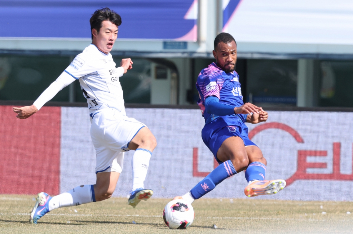 7일 경기도 파주 스타디움에서 하나은행 K리그2 2026 파주 프런티어FC 대 수원 삼성 경기가 열렸다. 파주 FC 보닐라가 수원 삼성 이건희의 수비가 붙기 전에 크로스를 올렸다. 이 경기는 K리그2의 일부였다.