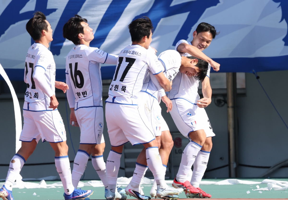 하나은행 K리그2 2026 파주 프런티어FC 대 수원 삼성 경기가 7일 경기도 파주 스타디움에서 열렸다. 수원 삼성 김지현이 헤더슛으로 첫 골을 터트렸다. 김지현은 첫 골을 터트린 후 동료들의 축하를 받았다.