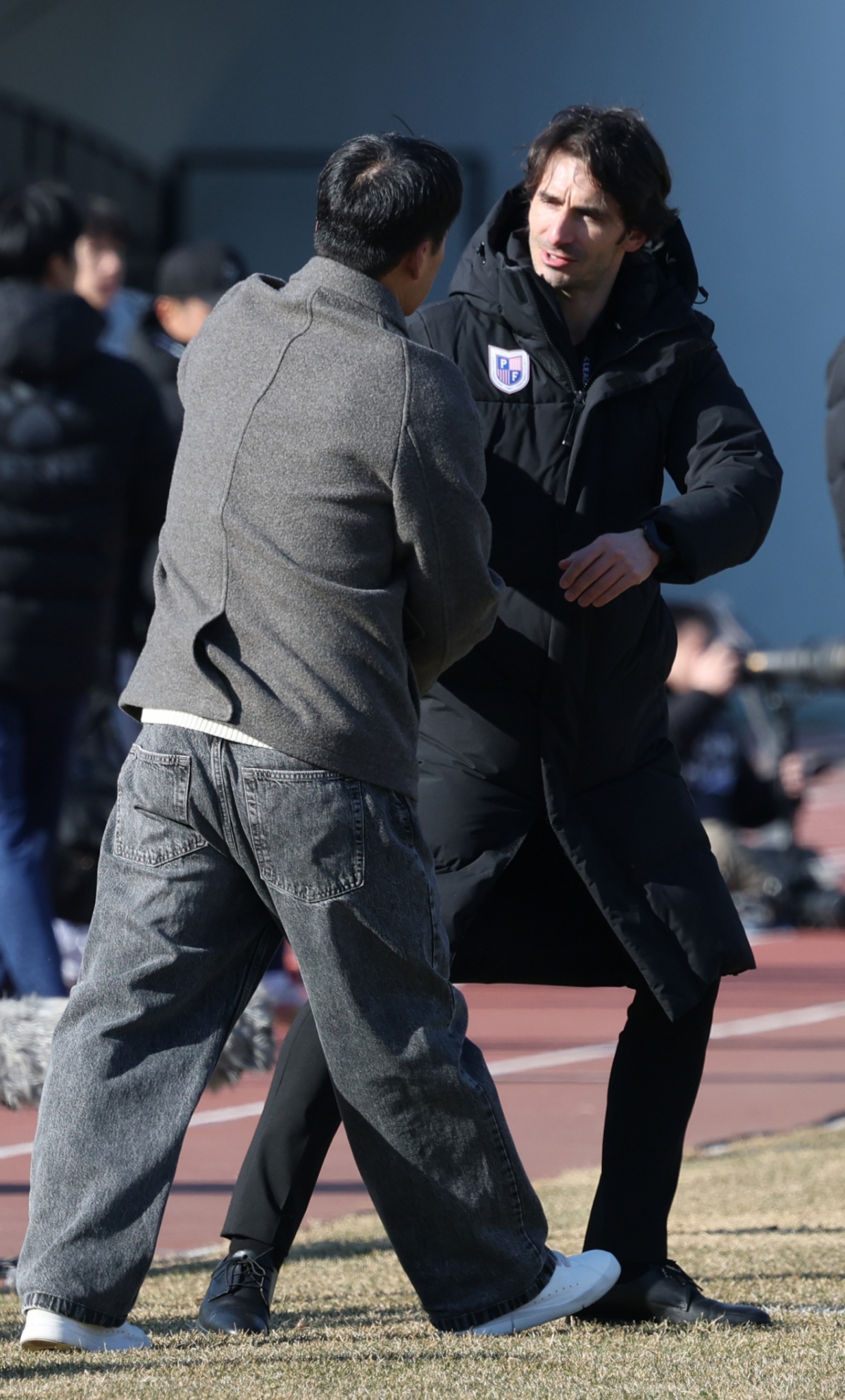 7일 경기도 파주 스타디움에서 하나은행 K리그2 2026 파주 프런티어FC 대 수원 삼성 경기가 열렸다. 이정효 수원 삼성 감독이 경기 후 제라드 파주 감독과 인사를 나눴다. 이정효 감독은 제라드 감독에게 '굿게임'이라고 말했다.
