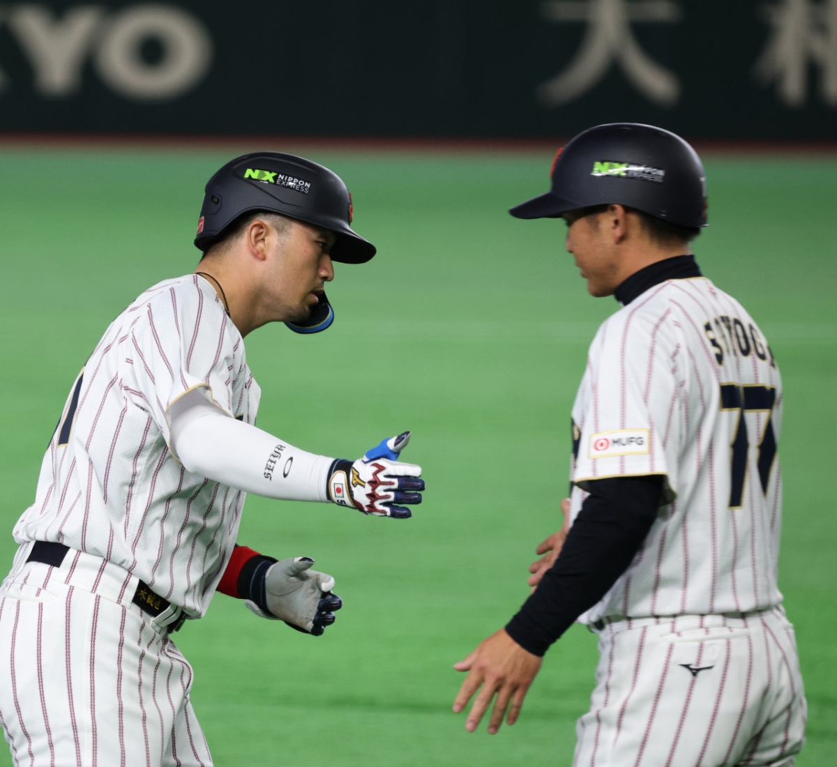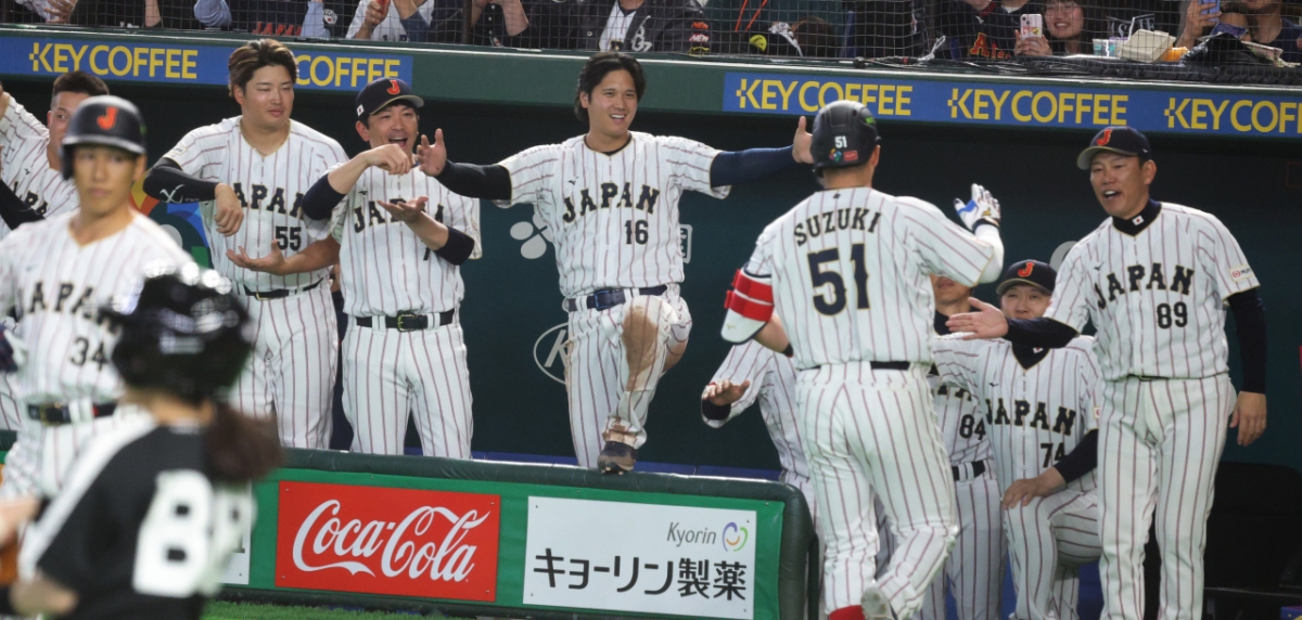 1회말 추격2점홈런을 쏘아올렸던 일본 3번타자 스즈키가 7일 도쿄돔에서 열린 2026WBC 도쿄POOL 대한민국과 일본의 경기 3회말 2사에서 고영표를 상대로 역전홈런을 터트린 후 홈인하고 있다. 장난기가 발동한 오타니가 홈인하는 스즈키에게 깜짝쇼(?)를 펼치고 있다.