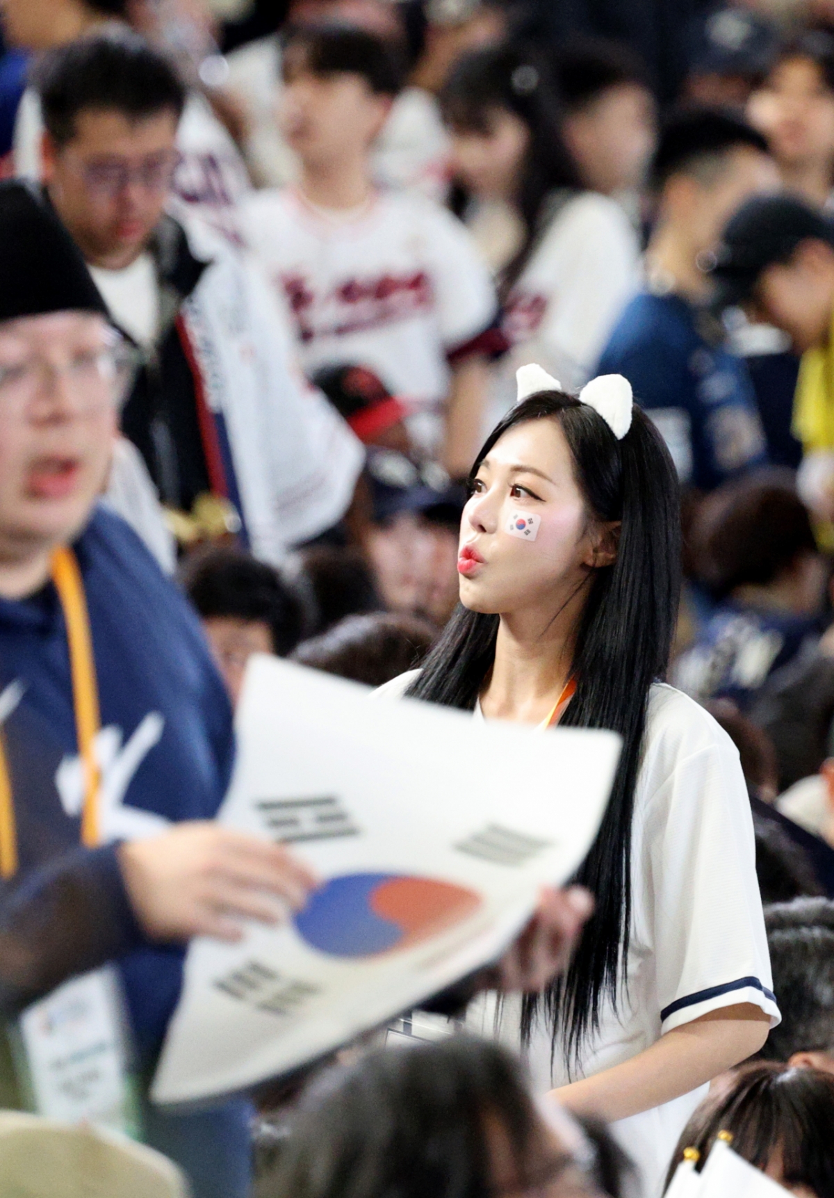 치어리더 차영현이 8일 도쿄돔에서 열린 2026 WBC 도쿄POOL 대한민국과 대만 경기를 앞두고 응원단에 태극기를 나눠주고 있다. 026.03.08.