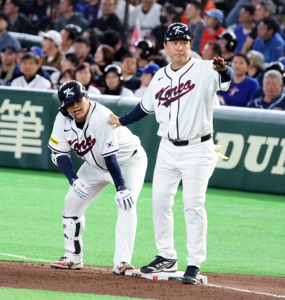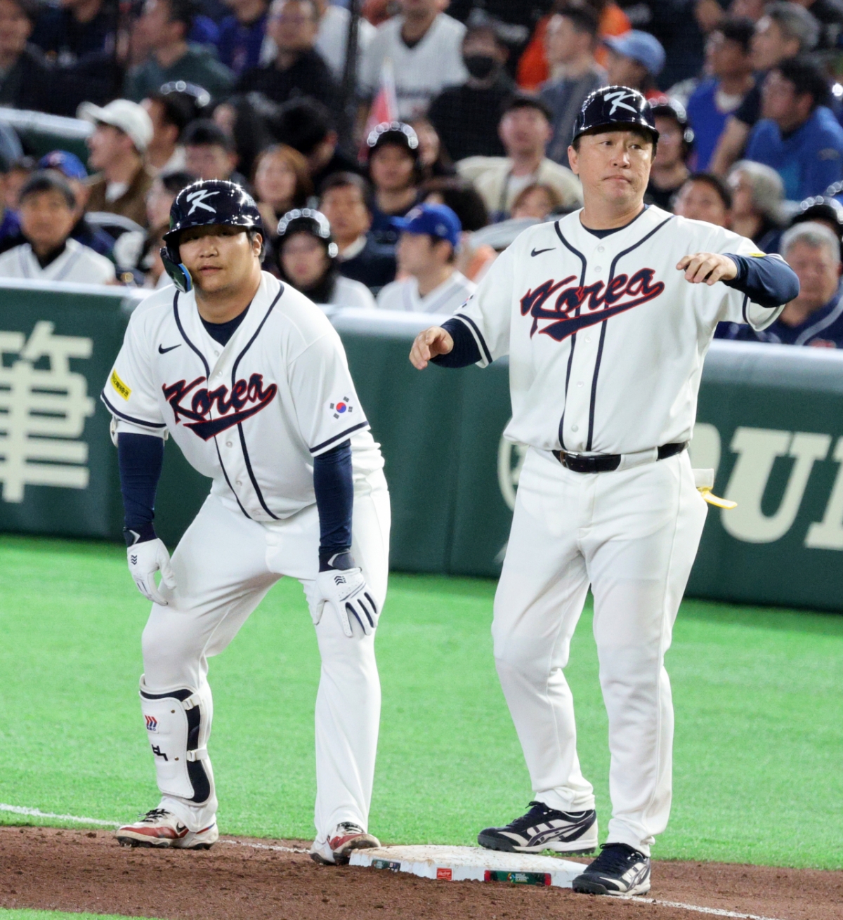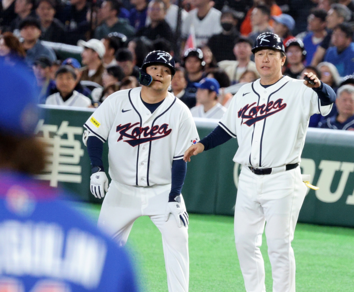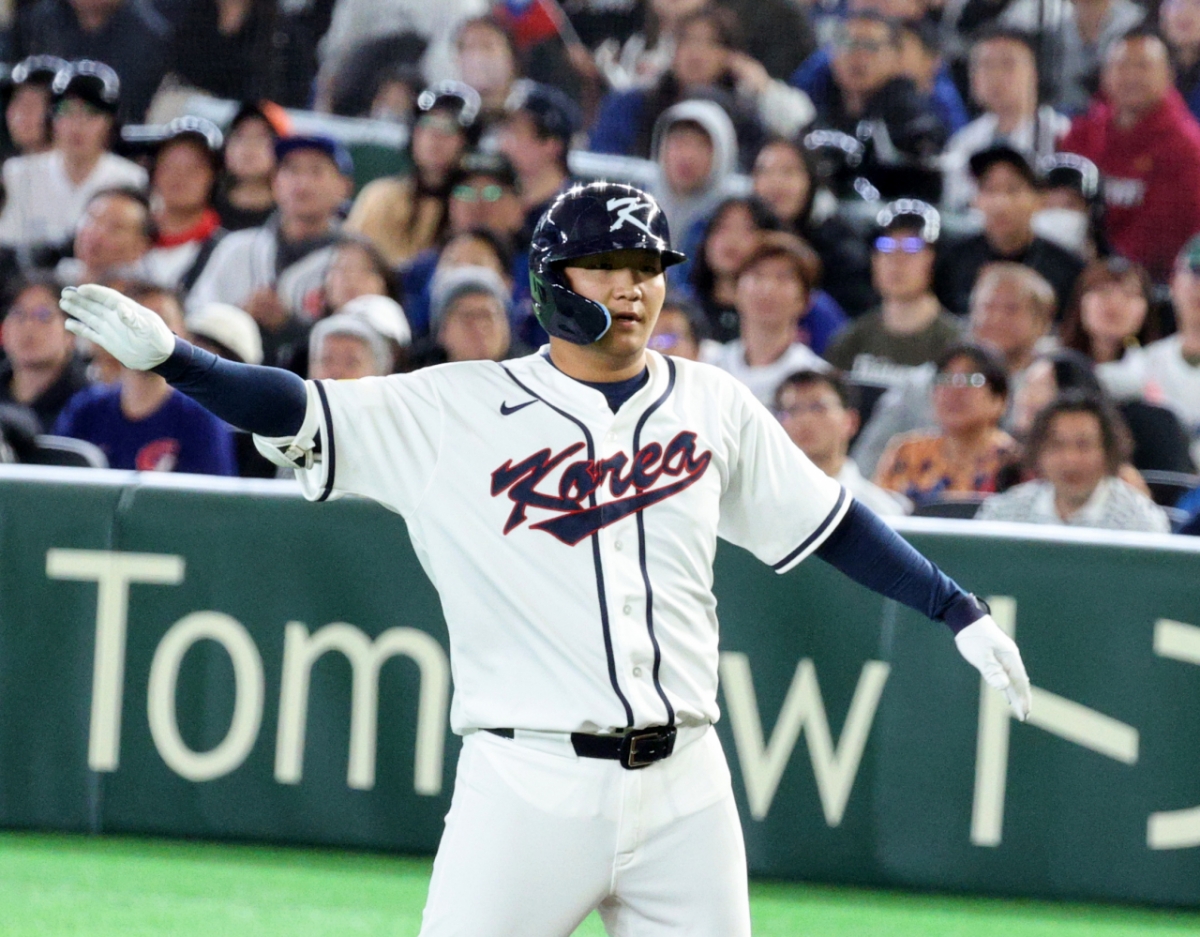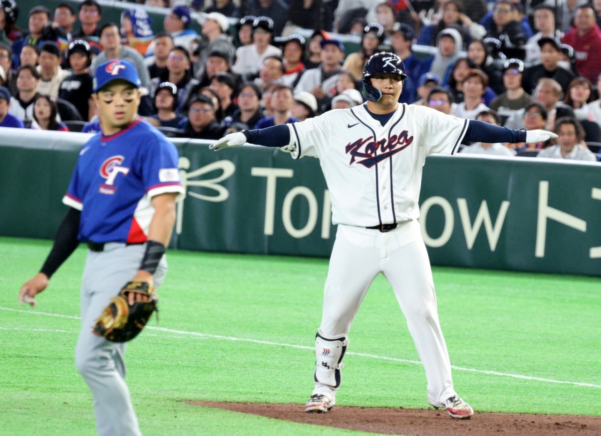 한국 5번타자 문보경이 8일 도쿄돔에서 열린 2026 WBC 도쿄POOL 대한민국과 대만 경기 5회말 무사 1루에서 안타로 출루하며 1,3루 찬스를 만들고 있다. 026.03.08.