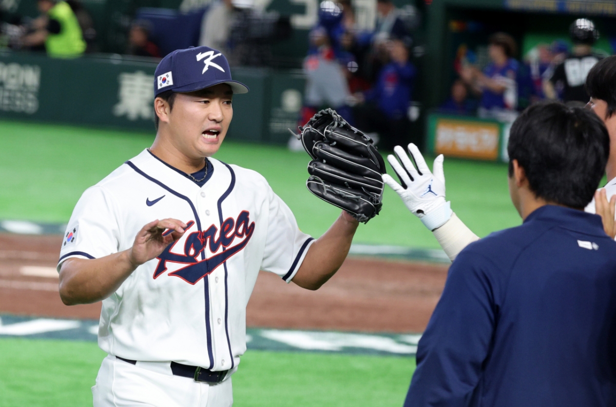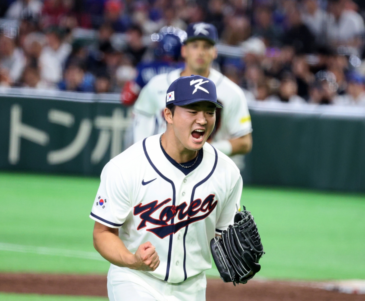 한국 우완투수 고우석 8일 도쿄돔에서 열린 2026 WBC 도쿄POOL 대한민국과 대만 경기 8회초 무실점 피칭을 펼친후 환호하고 있다. 026.03.08.