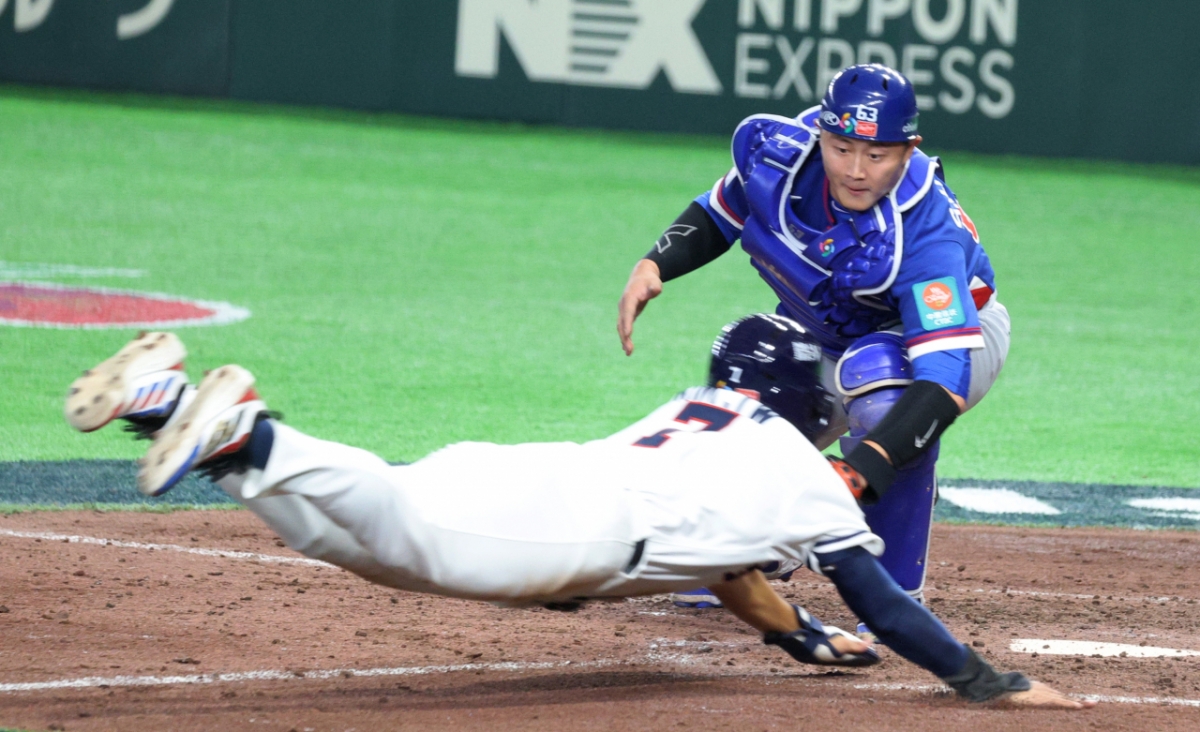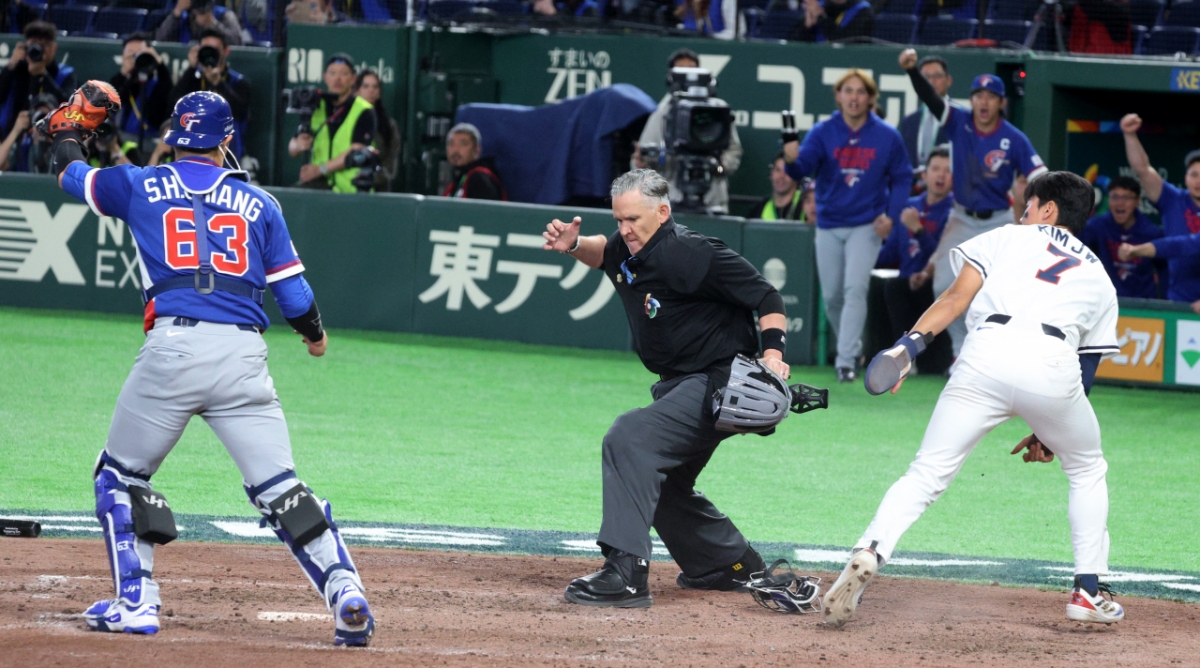 김주원이 8일 도쿄돔에서 열린 2026 WBC 도쿄POOL 대한민국과 대만 경기 승부치기 10회말 1사 3루 김혜성의 1루수앞땅볼때 홈에서 태그아웃되고 있다. 026.03.08.