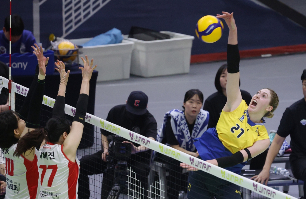 현대건설 카리가 페퍼저축은행 더블 블로킹 위로 강스파이크를 날리고 있다.