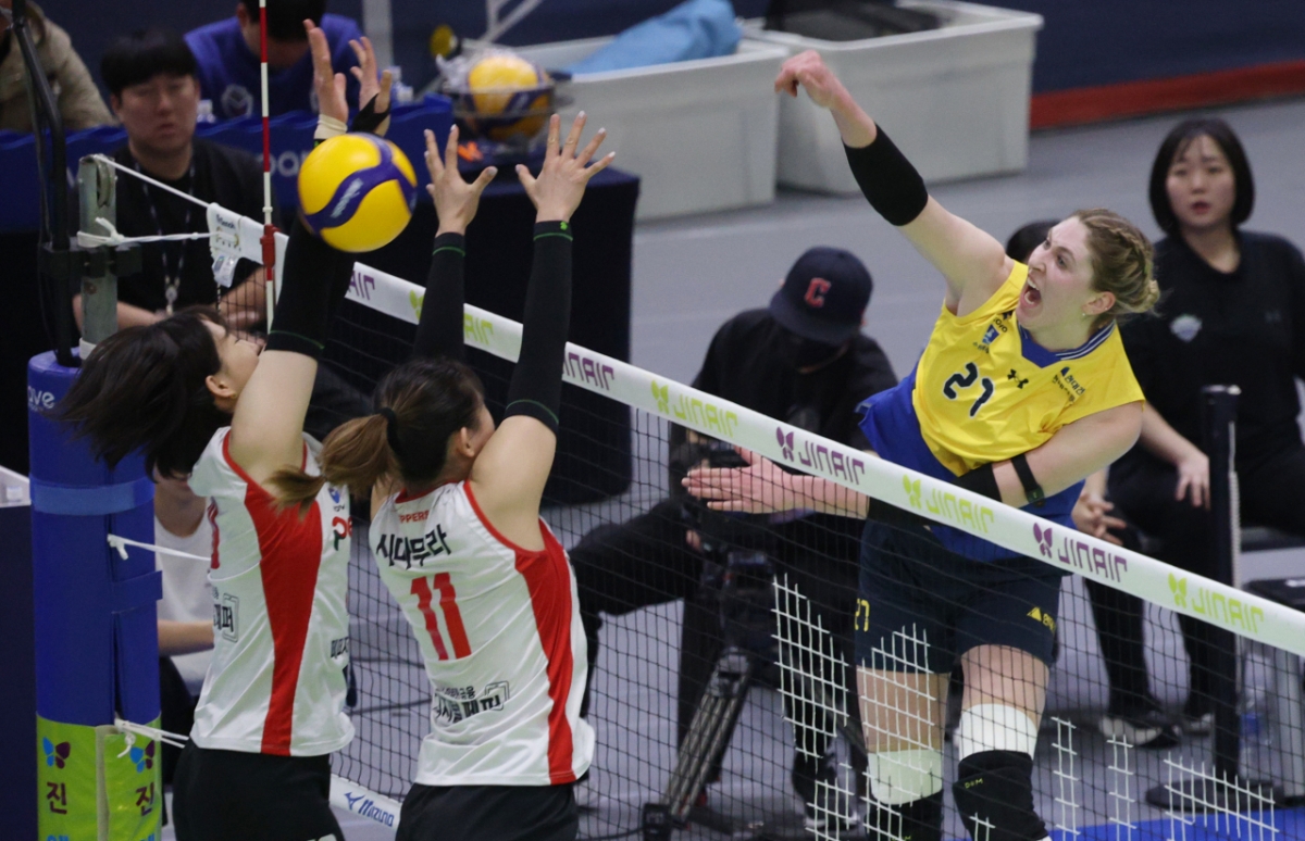 현대건설 카리가 페퍼저축은행 더블 블로킹 위로 강스파이크를 날리고 있다.