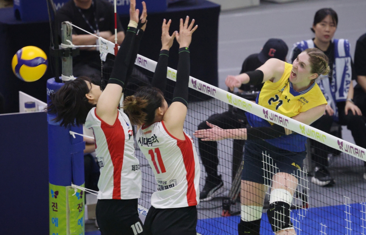 현대건설 카리가 페퍼저축은행 더블 블로킹 위로 강스파이크를 날리고 있다.
