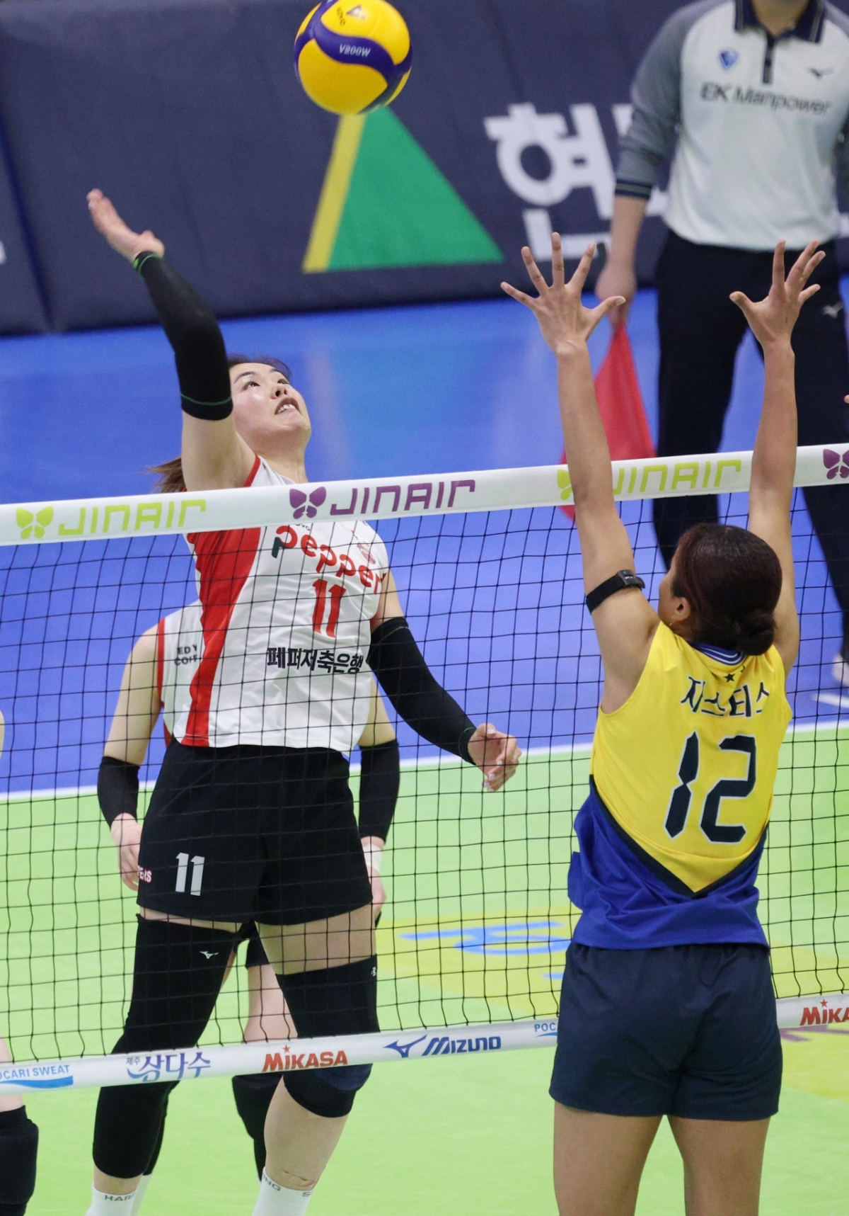 페퍼저축은행 시마무라가 현대건설 자스티스의 블로킹 위로 강스파이크를 날리고 있다.