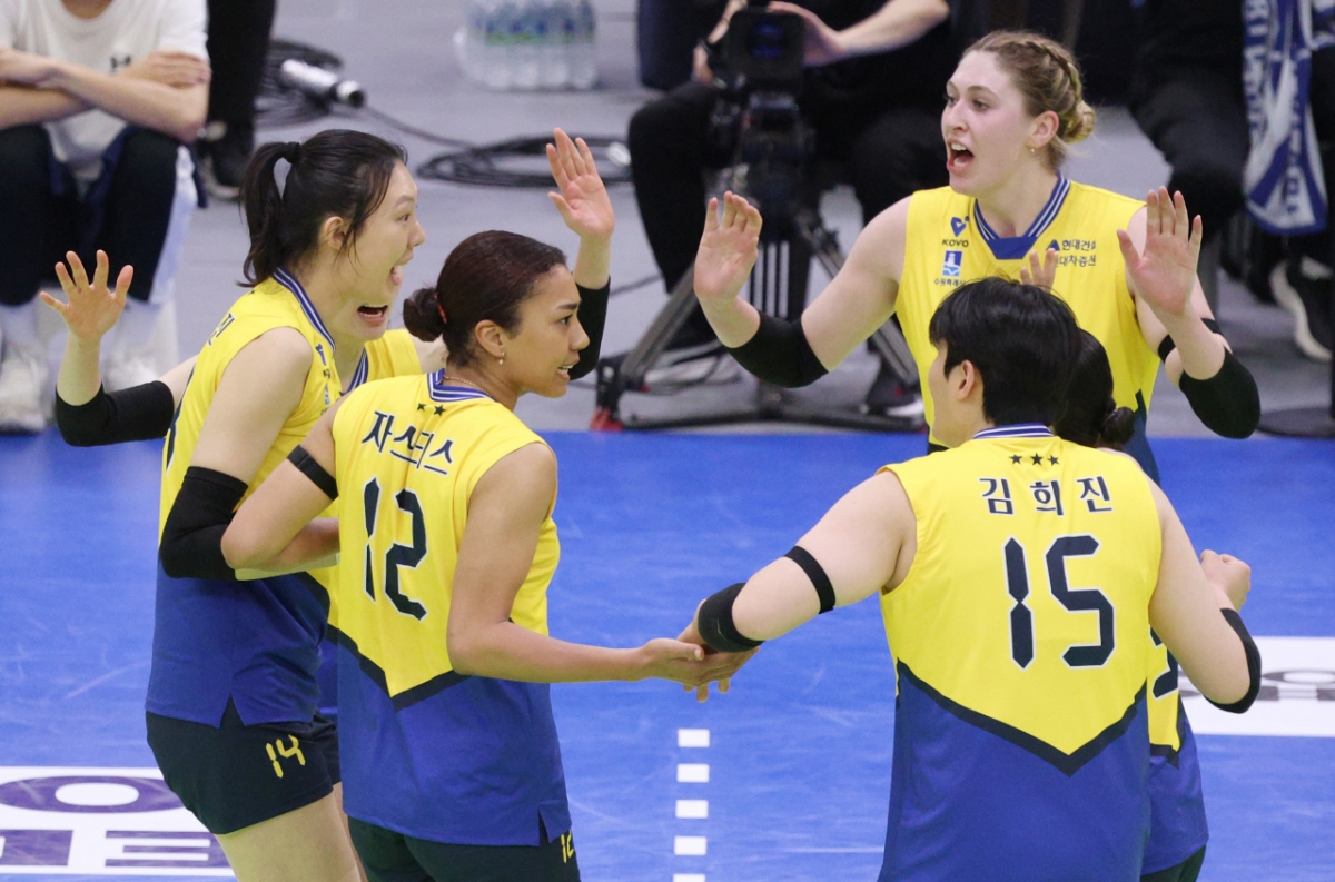 현대건설 양효진이 결정적인 득점을 한 후 동료들과 기뻐하고 있다.