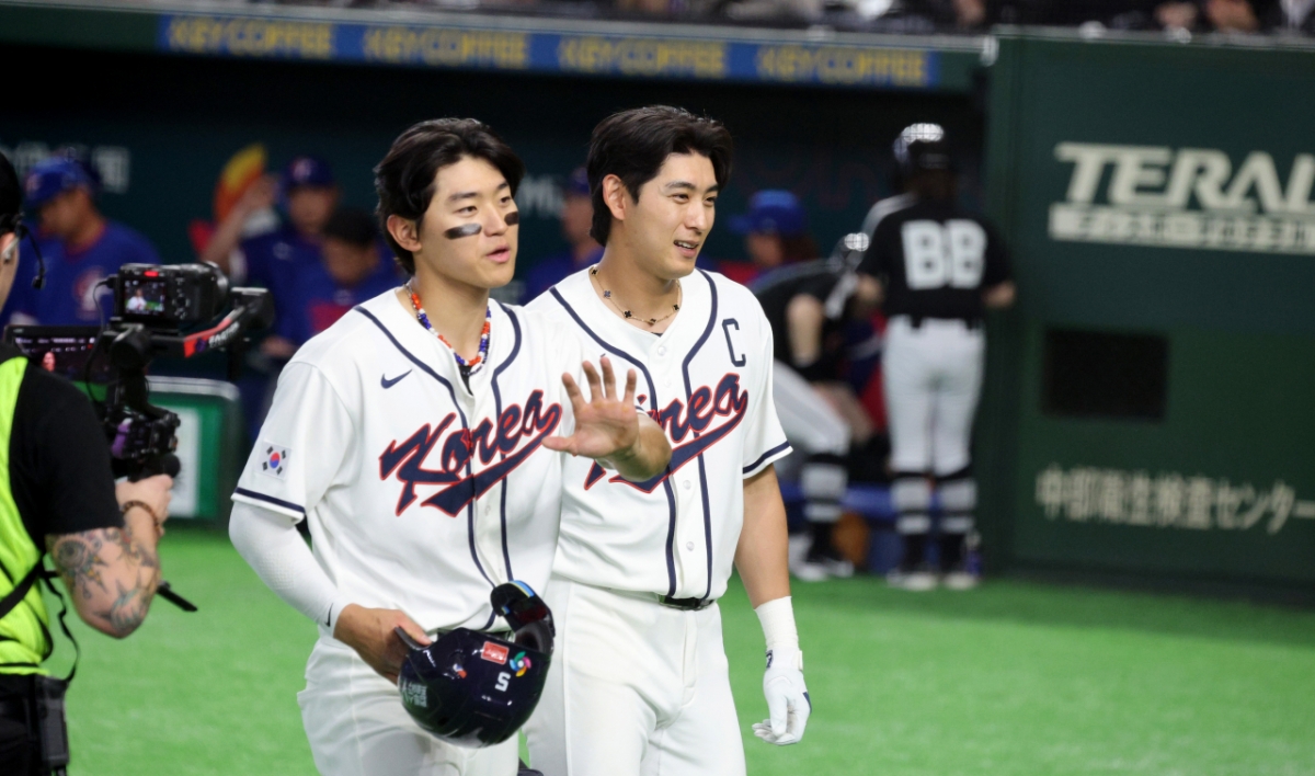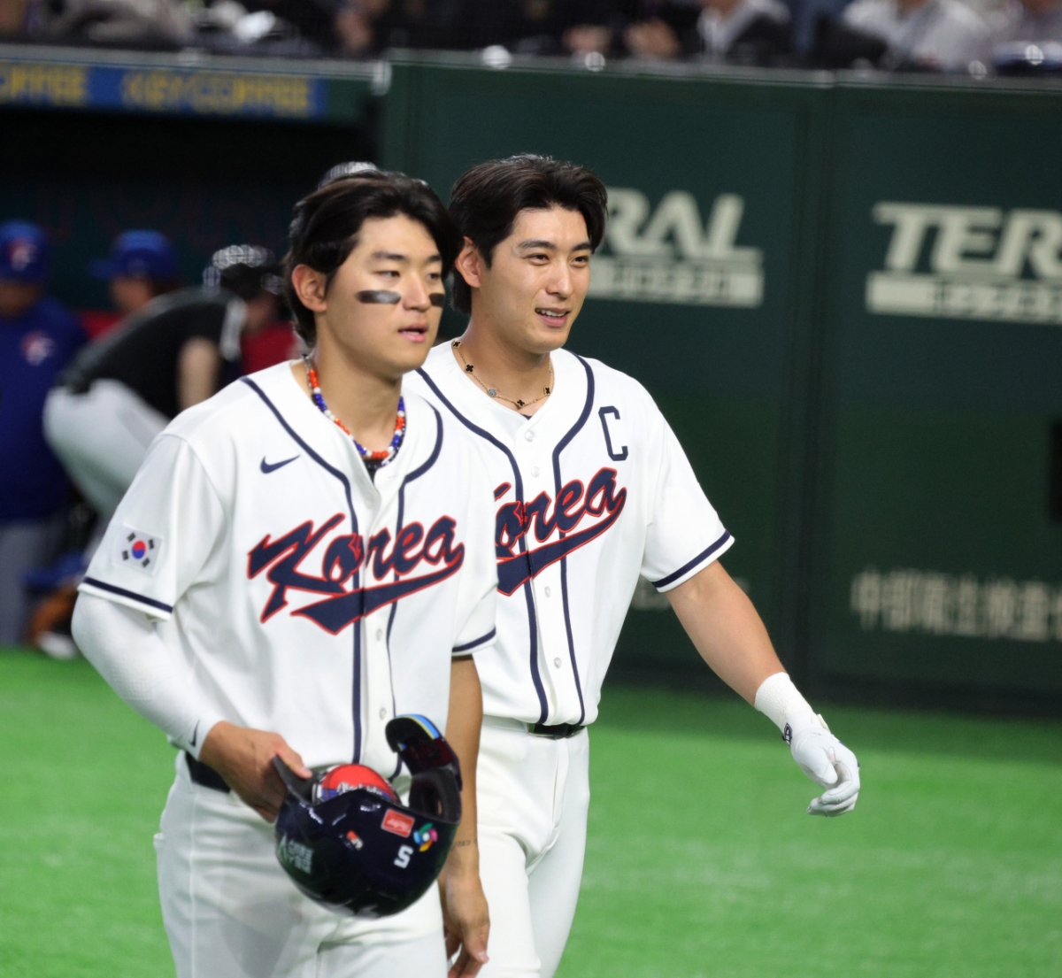 야구대표팀 김도영이 8일 도쿄돔에서 열린 2026 WBC 도쿄POOL 대한민국과 대만 경기 8회말 동점타를 터트린 후 공수교대때 이정후와 함께 더그아웃으로향하고 있다. 026.03.08.