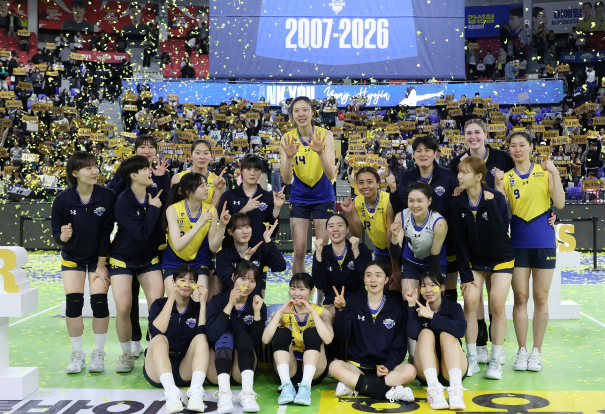 2025-2026 V-리그 여자부 현대건설 대 페퍼저축은행 경기 후 열린 은퇴식에서 양효진이 선수단과 기념촬영을 하고 있다.