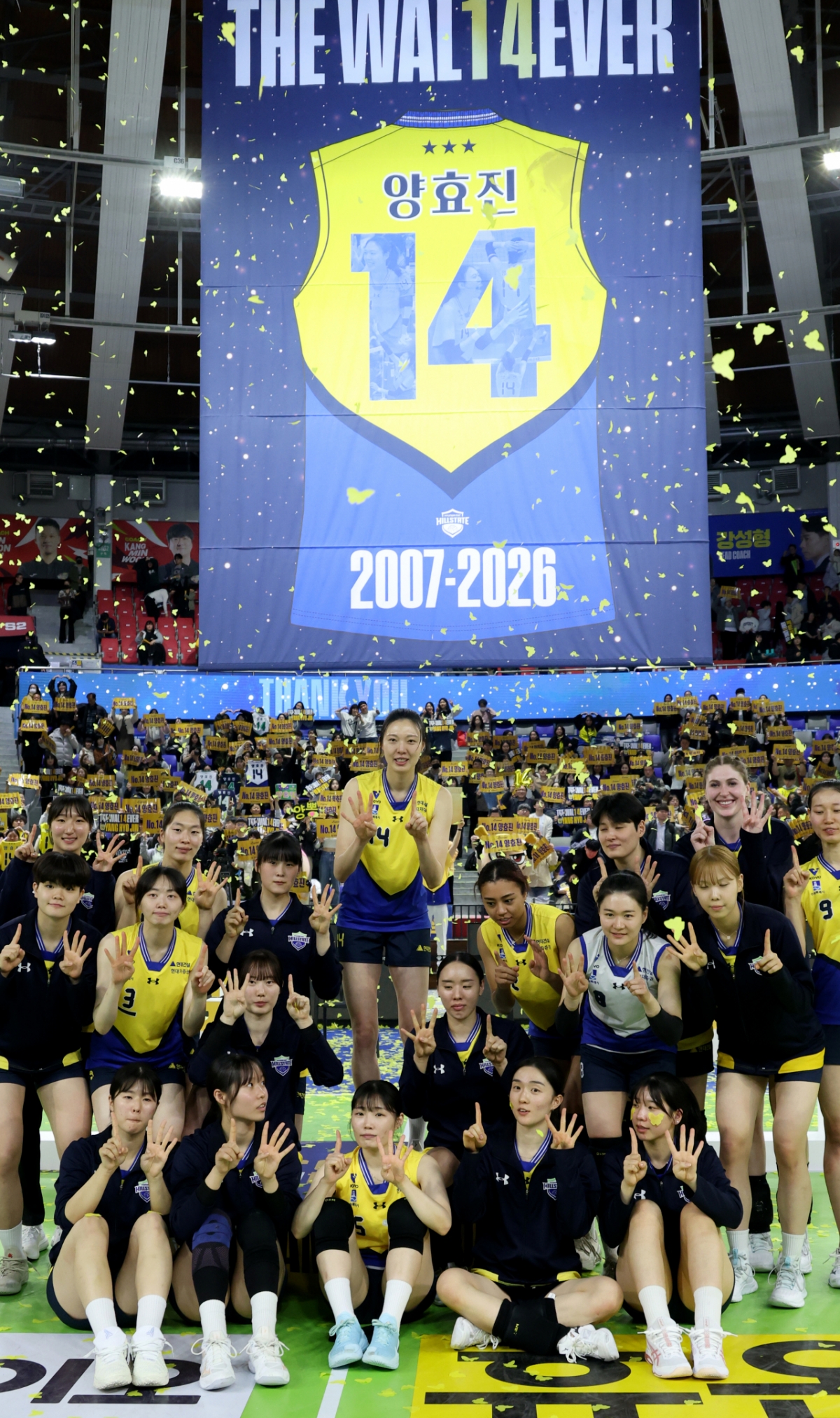 2025-2026 V-리그 여자부 현대건설 대 페퍼저축은행 경기 후 열린 은퇴식에서 양효진이 선수단과 기념촬영을 하고 있다.