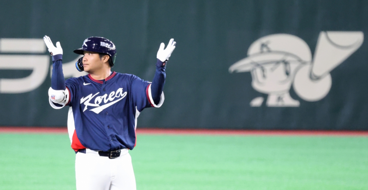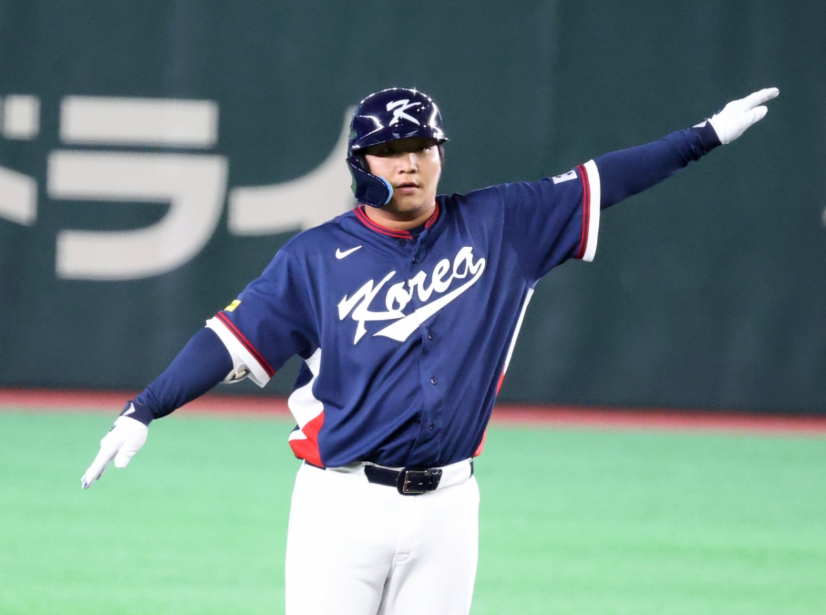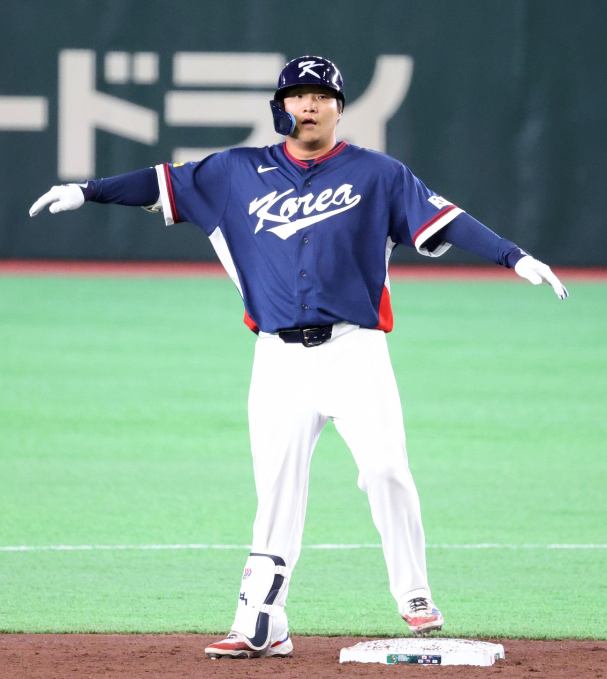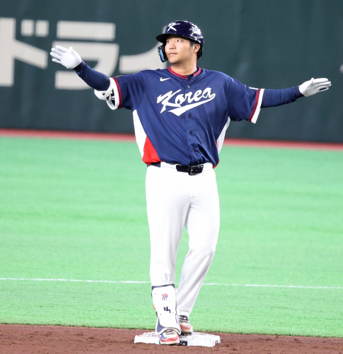 야구대표팀 5번타자 문보경이 9일 도쿄돔에서 열린 2026 WBC 도쿄POOL 대한민국과 호주 경기 3회초 1사 2루에서 2루타로 출루하고 있다. 026.03.08.