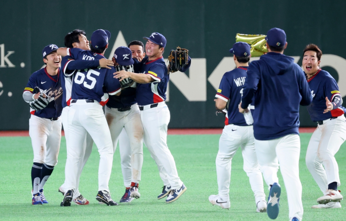 야구대표팀 주장 이정후가 9일 도쿄돔에서 열린 2026 WBC 도쿄POOL 대한민국과 호주 경기 9회말 호주의 마지막 타자의 플라이를 직접 처리하며 마이애미행을 확정한 후 외야에서 동료들과 뒤엉켜 울고 있다.. 026.03.08.