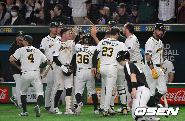 8회말 1사 2루에서 호주 트래비스 바자나의 적시타 때 호주 선수들이 환호하고 있다..2026.03.09/[email protected]