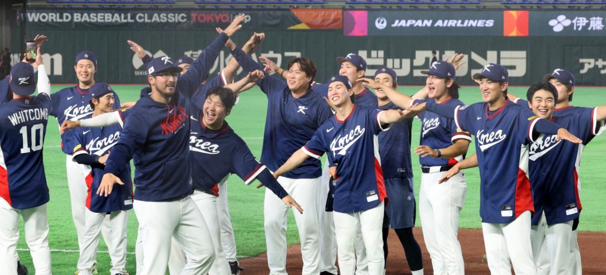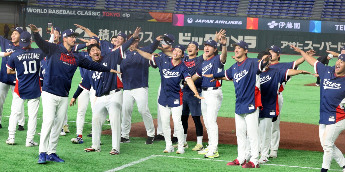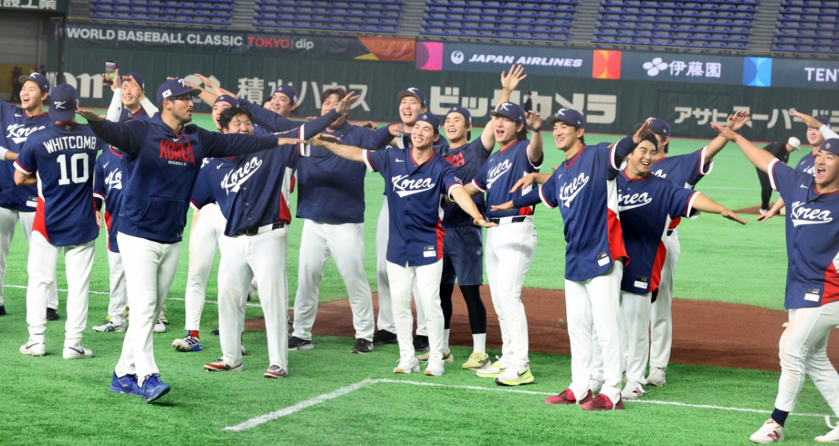 도쿄라운드에서 화제가 됐던 '비행기세리머니'를 펼치며 팬들의 응원에 감사인사를 대신하는 야구대표팀. 026.03.09.