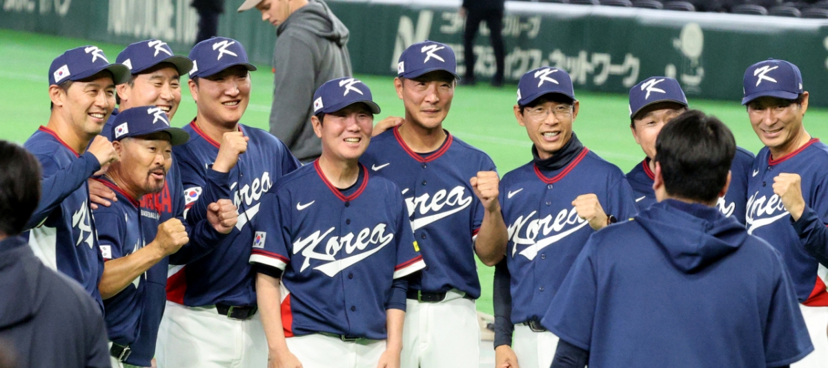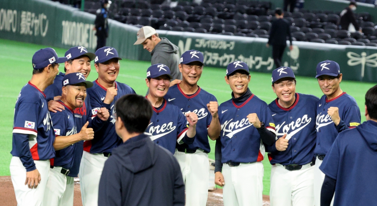 대한민국 야구대표팀이 9일 도쿄돔에서 열린 2026 WBC 도쿄POOL 대한민국과 호주 경기에서 7-2로 승리했다. 이 승리로 대한민국 야구대표팀은 마이애미행을 확정지었다. 류지현 감독과 코치들이 그라운드에서 기념촬영을 했다.