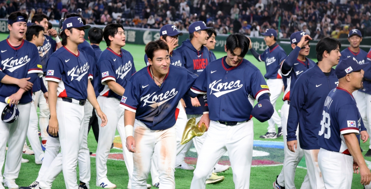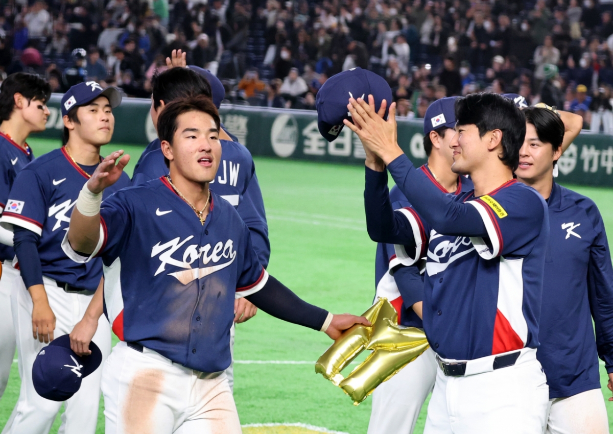 대한민국 야구대표팀이 9일 도쿄돔에서 열린 2026 WBC 도쿄POOL 대한민국과 호주 경기에서 7-2로 승리하며 마이애미행을 확정지었다. 아슬아슬하게 5점차 2실점을 유지한 쫄깃한 승부였다. 고영표가 팀후배 안현민에게 박수를 쳐주고 있다. 026.03.08.