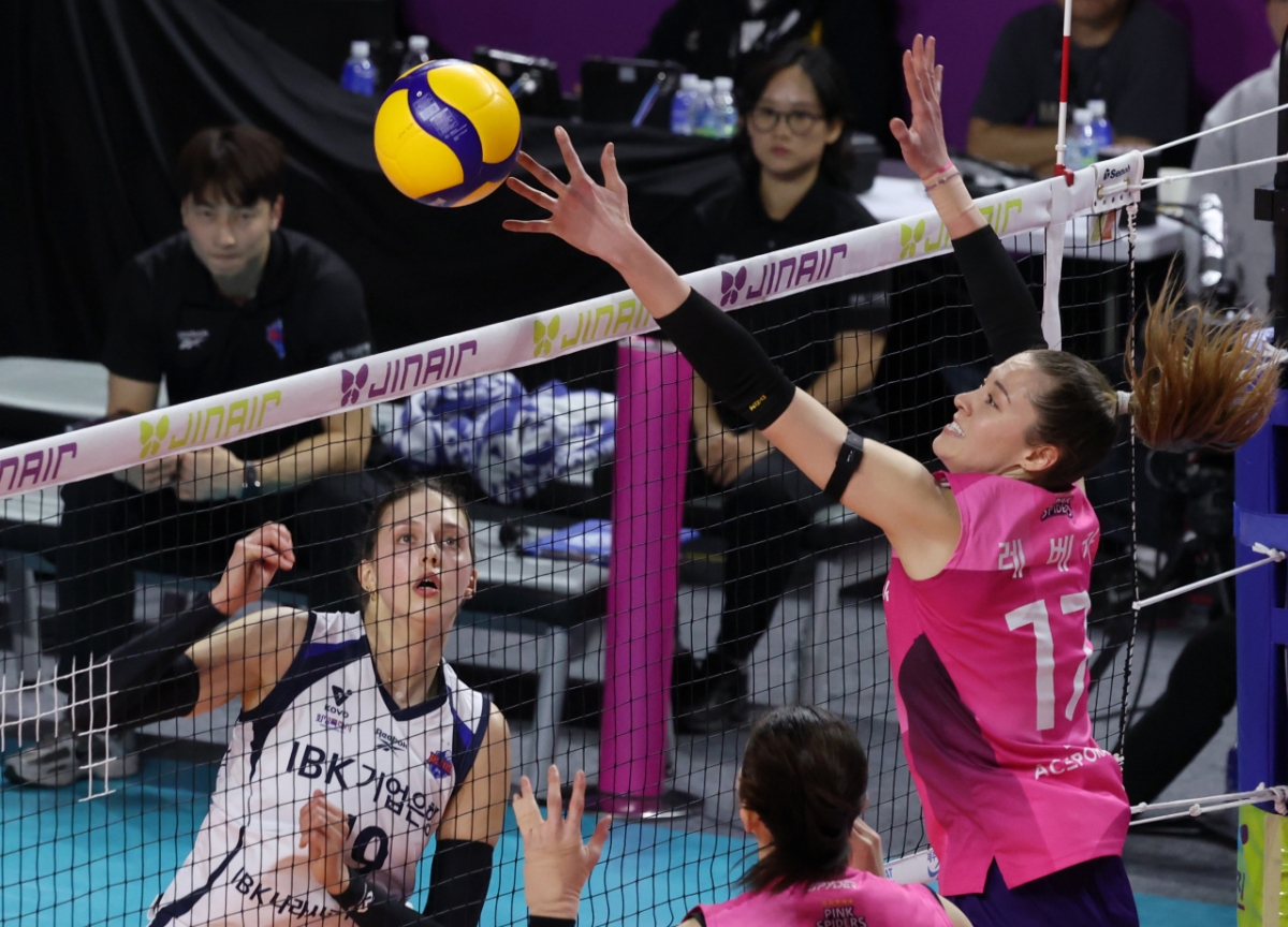 IBK기업은행 빅토리아가 흥국생명 레베카의 블로킹을 피해 연타를 날리고 있다.