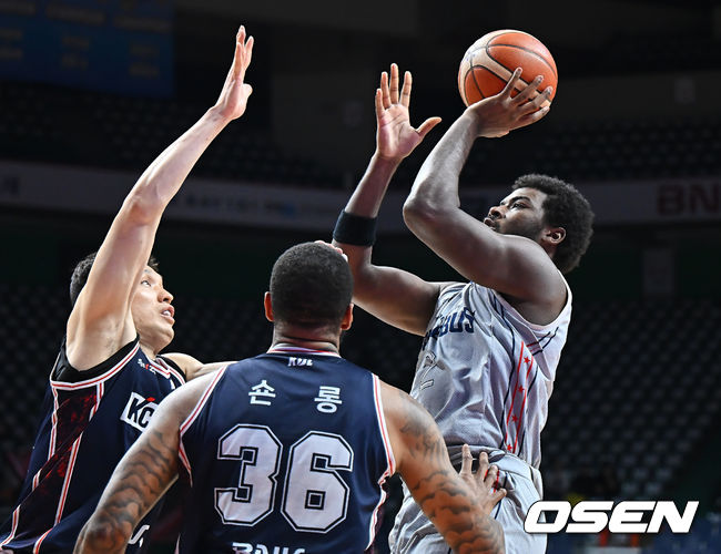 2025-2026 LG전자 프로농구 부산 KCC와 울산 현대모비스의 경기가 10일 부산 사직체육관에서 열렸다. 목 부상으로 허웅이 결장한 부산 KCC는 울산 현대모비스전에서 해법을 찾아야 했다. 울산 현대모비스의 레이션 해먼즈는 부산 KCC 장재석의 마크를 피해 골밑슛을 시도했다.