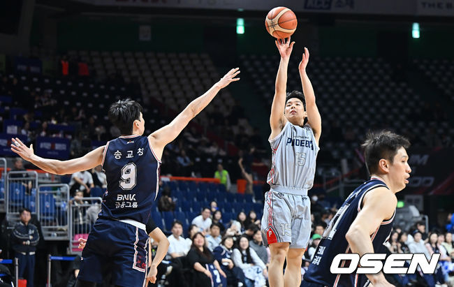 10일 부산 사직체육관에서 2025-2026 LG전자 프로농구 부산 KCC와 울산 현대모비스의 경기가 열렸다. 목 부상으로 허웅이 결장한 부산 KCC는 울산 현대모비스전에서 해법을 찾아야 했다. 울산 현대모비스 김건하가 부산 KCC 송교창의 마크를 피해 3점슛을 시도했다.