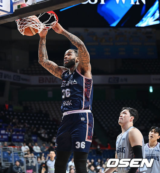 2025-2026 LG전자 프로농구 부산 KCC와 울산 현대모비스의 경기가 10일 부산 사직체육관에서 열렸다. 목 부상으로 허웅이 결장한 부산 KCC는 울산 현대모비스전에서 해법을 보여줄지 주목받았다. 경기 중 부산 KCC의 숀롱이 덩크슛을 성공시켰다.