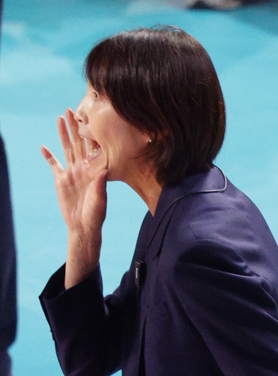 흥국생명 요시하라 감독이 선수들을 독려하고 있다.