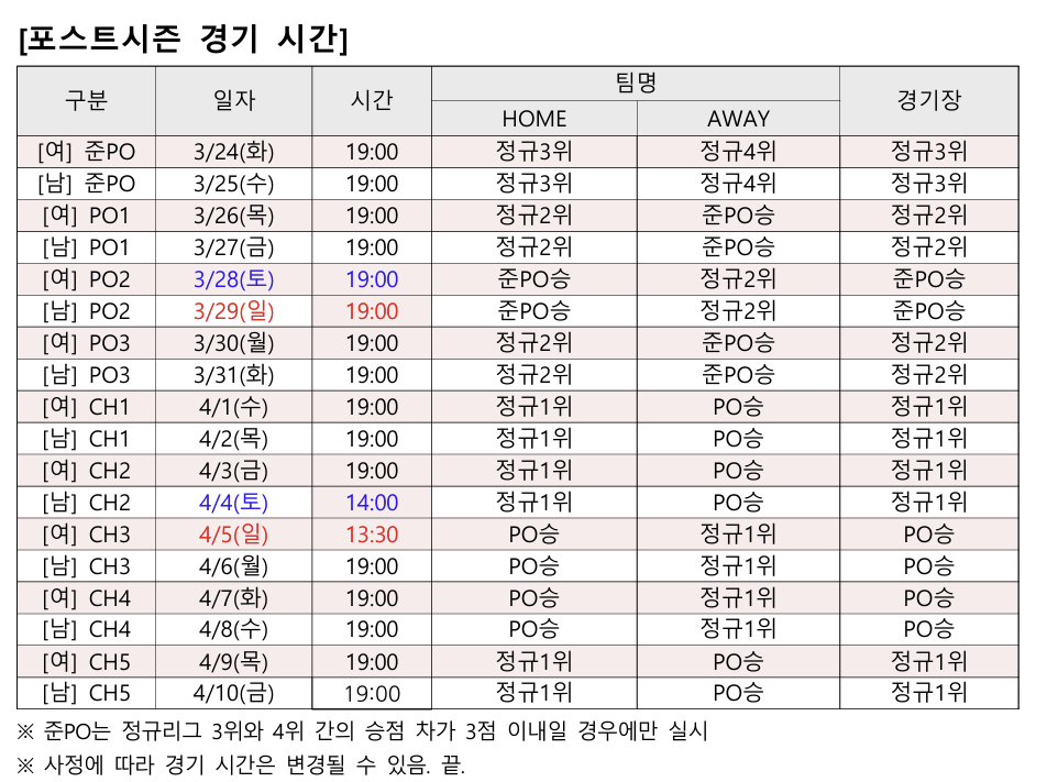 포스트시즌은 내달 4일 오후 2시 열리는 남자부 챔피언 결정전 2차전, 다음날 오후 1시 30분 열리는 여자부 챔피언 결정전 3차전을 제외하고 모두 오후 7시에 열린다.