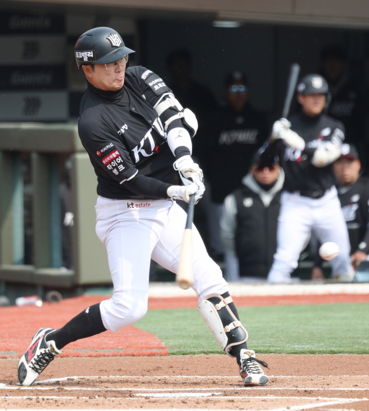 2026 신한 SOL Bank KBO리그 시범경기 롯데 자이언츠 대 KT 위즈 경기가 12일 부산 사직야구장에서 열렸다. KT 허경민이 1회초 호쾌한 타격을 했다. 이 경기는 시범경기였다.