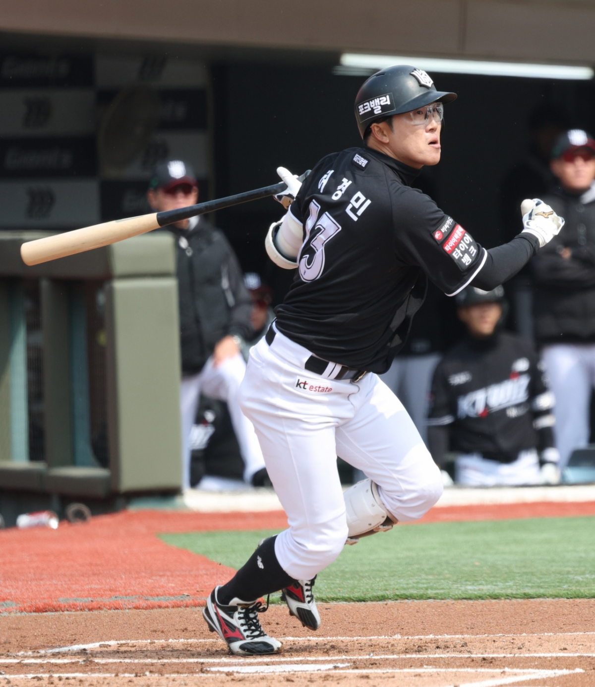 KT 허경민이 1회초 호쾌한 타격을 하고 있다.