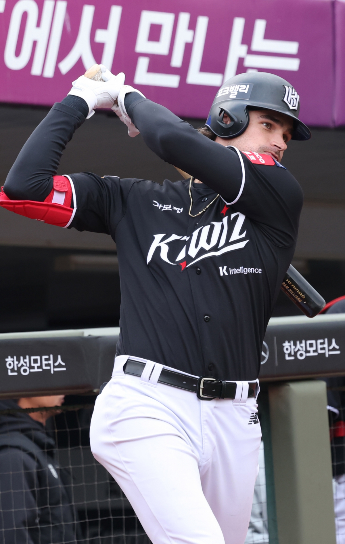 2026 신한 SOL Bank KBO리그 시범경기 롯데 자이언츠 대 KT 위즈 경기가 12일 부산 사직야구장에서 열렸다. KT 힐리어드가 타석에 들어서기 전 스윙을 했다. 이 경기는 부산 사직야구장에서 진행되었다.