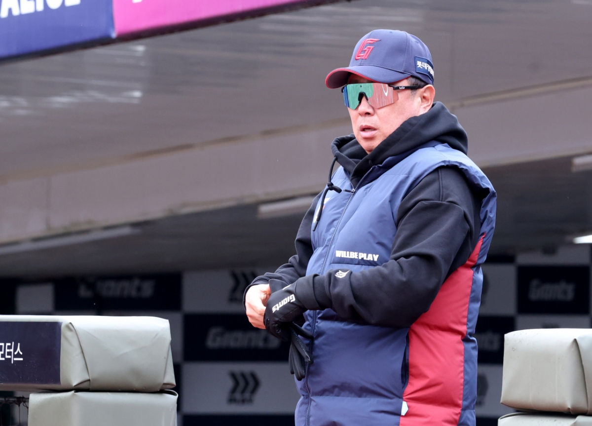 2026 신한 SOL Bank KBO리그 시범경기 롯데 자이언츠 대 KT 위즈 경기가 12일 부산 사직야구장에서 열렸다. 롯데 김태형 감독이 그라운드를 응시했다. 이 경기는 시범경기였다.