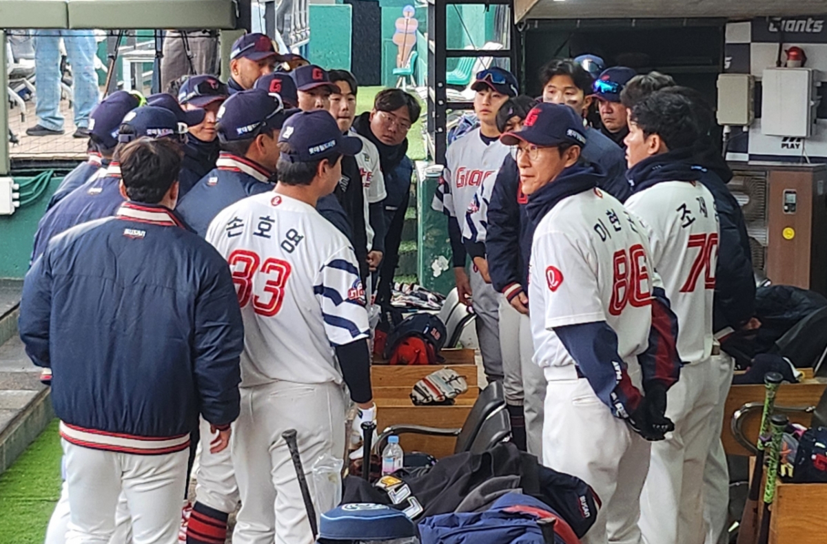 2026 신한 SOL Bank KBO리그 시범경기 롯데 자이언츠 대 KT 위즈 경기가 12일 부산 사직야구장에서 열렸다. 손호영을 비롯한 롯데 선수들이 경기 전 더그아웃에서 결의를 다졌다. 이들은 '오직 승리뿐'이라는 각오를 보였다.