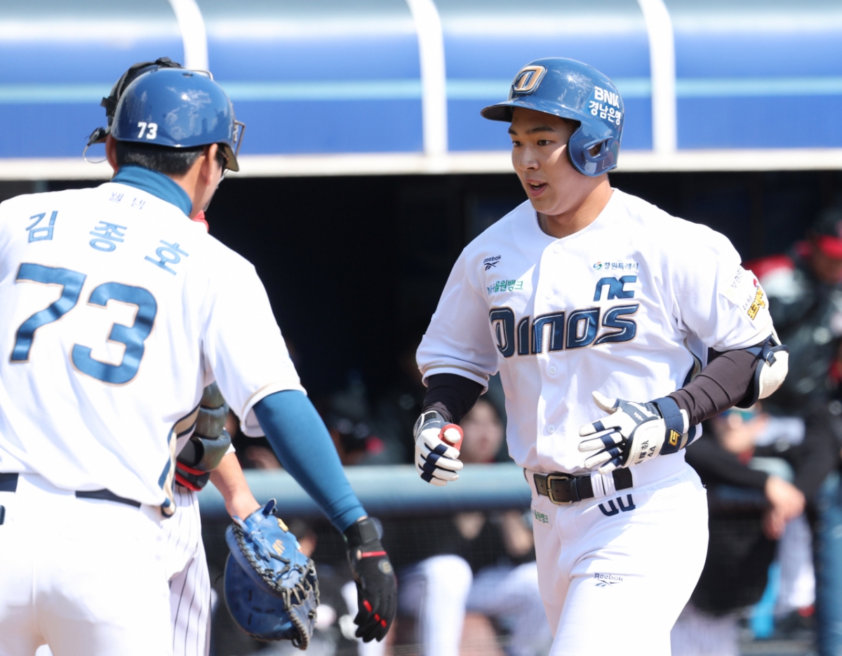 NC 김휘집이 2회말 무사에서 선제 1점 홈런을 날리고 홈인하고 있다.