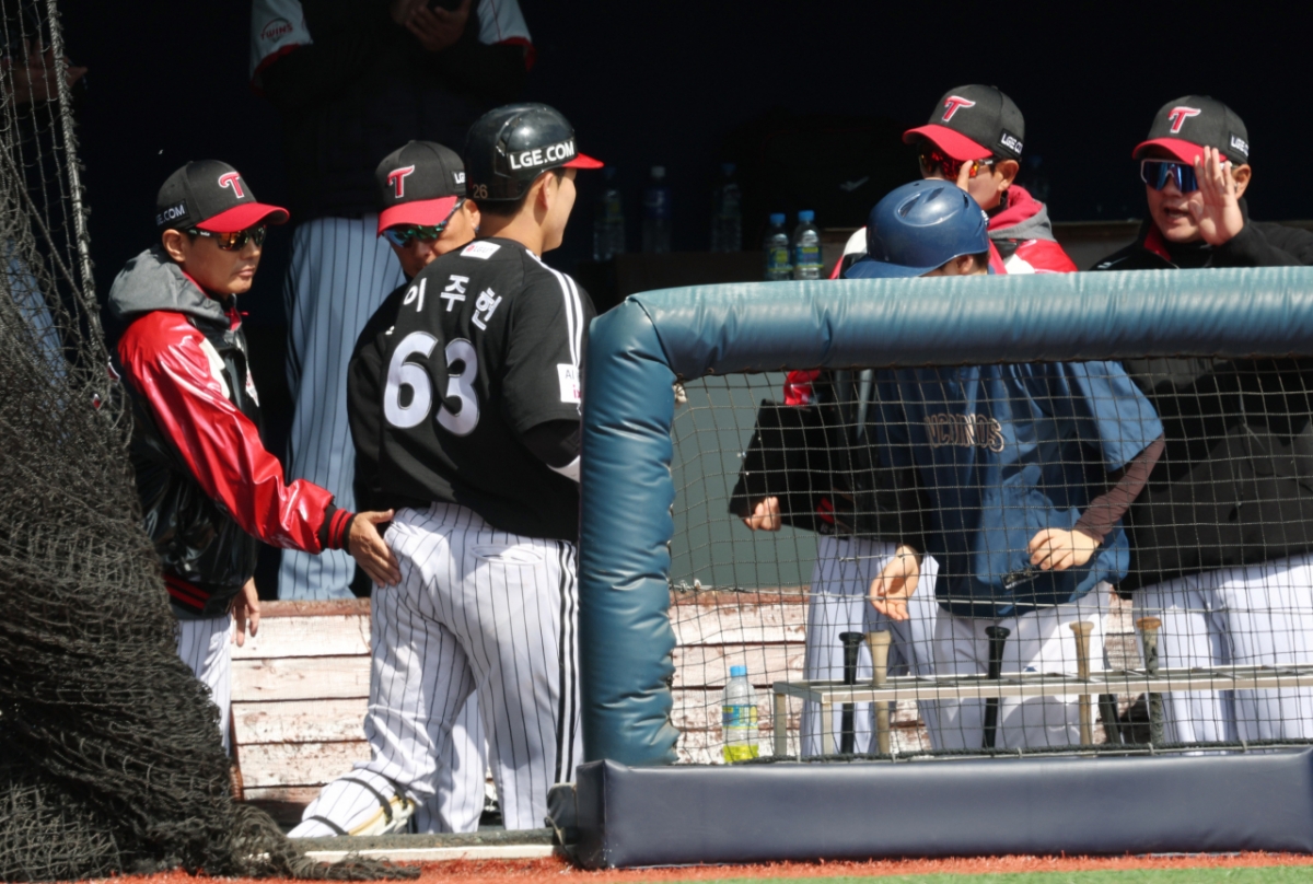 2026 신한 SOL Bank KBO리그 시범경기 NC 다이노스와 LG 트윈스의 경기가 13일 경남 창원시 마산야구장에서 열렸다. LG 이주헌은 3회초 1사에서 동점 좌월 1점 홈런을 날렸다. 이주헌은 홈인한 후 염경엽 감독의 환영을 받았다.