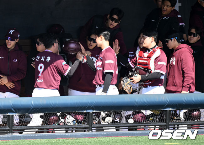 2026 신한 SOL KBO리그 시범경기 두산 베어스와 키움 히어로즈의 경기가 13일 경기도 이천 베어스파크에서 열렸다. 두산은 잭로그, 키움은 유토를 선발 투수로 내세웠다. 4회초 1사 1,2루에서 키움 박찬혁의 좌전 적시 2루타 때 홈을 밟은 2루주자 안치홍이 더그아웃에서 환호했다.