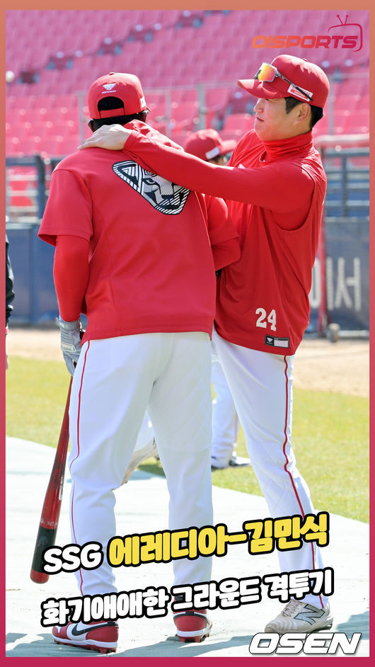3월 13일 광주기아챔피언스필드에서 2026 신한 SOL KBO리그 시범경기 KIA 타이거즈와 SSG 랜더스의 경기가 열렸다. 경기 전 SSG 김민식이 그라운드 위에서 에레디아와 장난을 쳤다. 김민식은 에레디아에게 니킥을 하는 듯한 모습을 보였다.