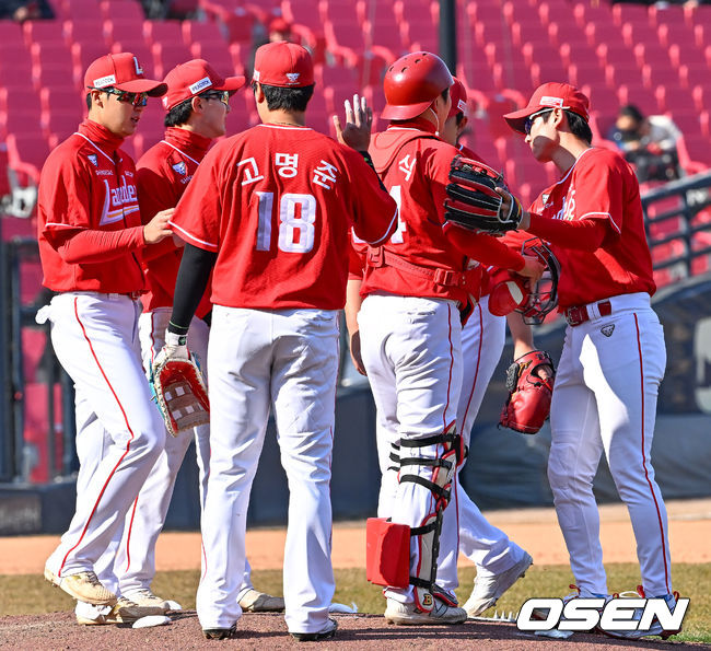 경기를 마치고 SSG 선수들이 마운드 위에서 승리의 기쁨을 나누고 있다. 2026.03.13 / [email protected]